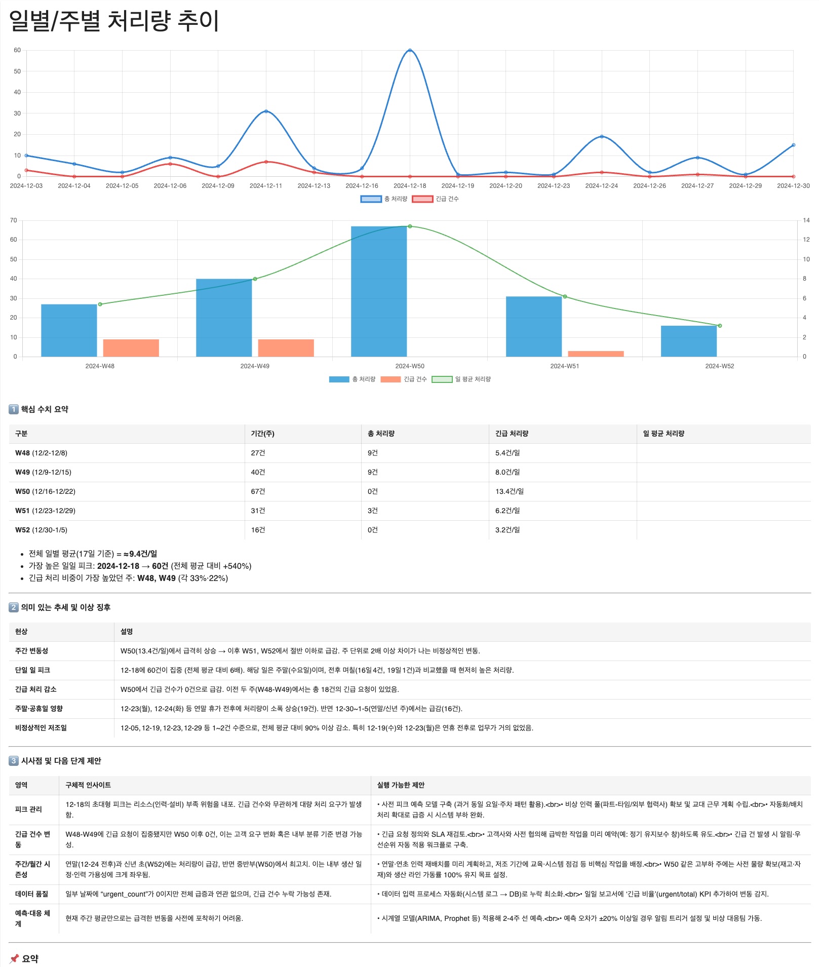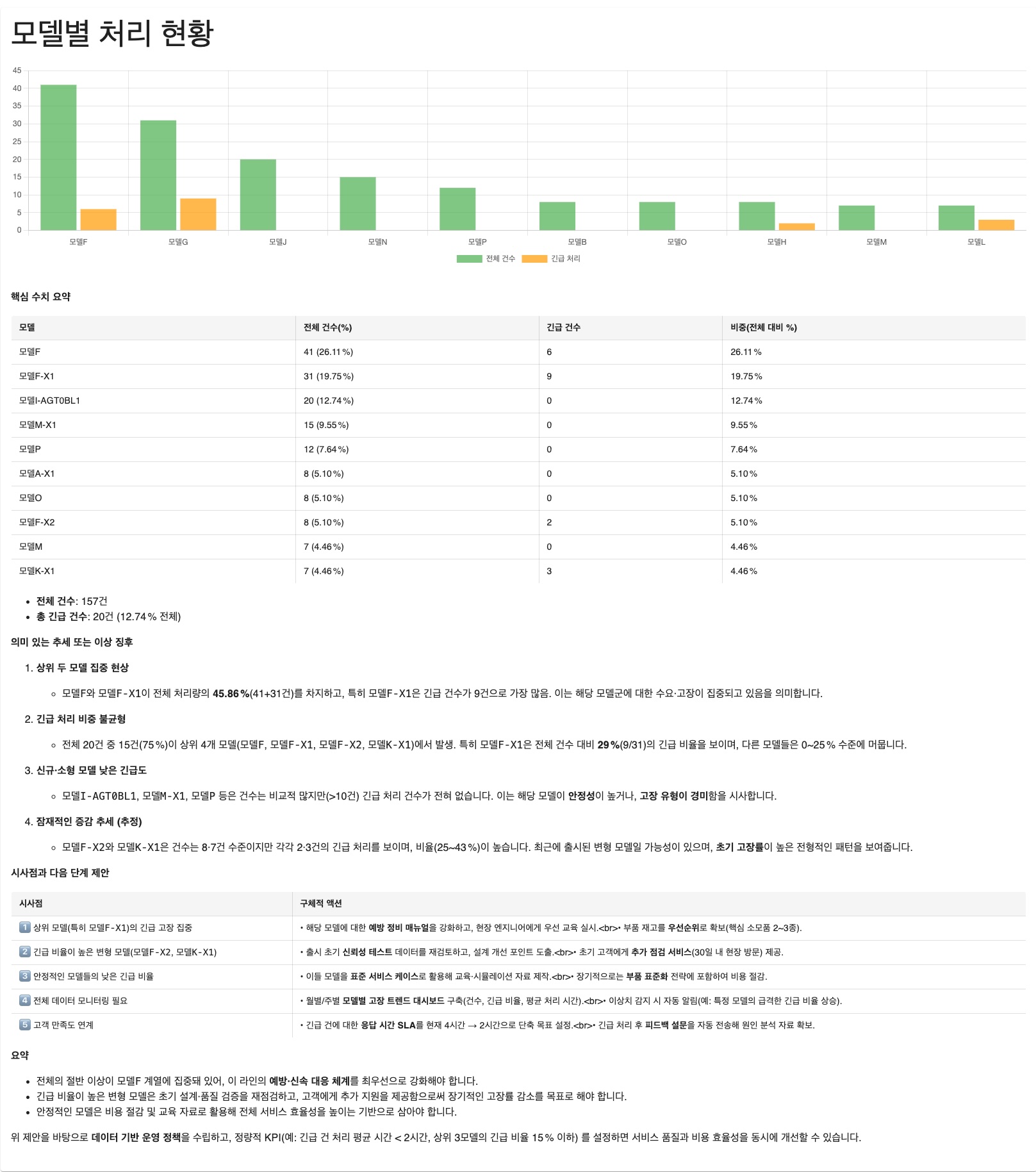 🧠 AI 데이터 분석가 & 자동 보고서 생성 서비스“데이터만 있으면, AI가 분석부터 보고서까지 완성합니다.”서비스 소개매번 엑셀을 정리하고, 수치를 계산하고, PPT 보고서를 만드는 일…이제 AI가 대신합니다.실제 제조업체에 사내 데이터 기반 AI 보고서, 데이터 분석, 작업물 피드백 기능이 AI 데이터 솔루션 도입 경험이 있는 업체입니다.다양한 형태의 자료를 AI가 자동으로 해석하고 보고서 형태로 완성되게 도와드립니다.이 서비스는 단순한 자동 요약이 아닙니다.AI가 데이터를 읽고, 의미를 분석하고, 트렌드·이상값·인사이트를 시각화합니다.---주요 기능1. 데이터 자동 분석DB 데이터를 기반으로 주요 지표, 이상값, 트렌드 자동 분석2. AI 기반 인사이트 도출자연어 질의에 필요한 데이터를 알아서 수집하여 데이터 분석가같은 인사이트 답변3. 자동 보고서 생성분석 결과를 자동으로 보고서 형태로 정리기업별 맞춤형 템플릿 반영 가능---실제 적용 사례제조업 : 불량 데이터 자동 분석 원인별 개선안 자동 제안품질관리팀 : NCR / Claim 보고서 자동 요약영업팀 : 월간 매출 추이 자동 분석 프리젠테이션 자동 생성경영진용 리포트 : KPI 기반 AI 인사이트 보고서 자동 생성 1️⃣ 상담 및 요구사항 정의고객사의 데이터베이스 구조(MySQL, PostgreSQL, MSSQL, SQLite 등) 및분석 목적(품질, 생산, 매출, 고객 등)을 파악합니다.주요 질문 예시를 함께 정리합니다.예: “이번 달 불량률은?”, “지난 분기 대비 생산량 추이는?”, “A라인의 평균 생산성은?”이 단계에서 AI가 어떤 질문을 처리해야 하는지 명확히 정의합니다.-> 오프라인 미팅 1~2회 가능합니다2️⃣ 데이터 연결 및 환경 세팅고객사의 DB 를 연결합니다.데이터 스키마를 AI가 이해할 수 있도록 자동 인덱싱 및 컬럼 의미 매핑을 수행합니다.사내망(On-Premise) 환경에서도 작동하도록 FastAPI + LangChain + Supabase + Langfuse 기반 백엔드 구성가능.내부망 서버 설치가능. 단 AI 는 외부 API(OpenAI, GCP Vertex AI 등) 사용.AI API 는 정책상 ChatGPT 와 다르게 데이터를 학습에 사용하지 않고 삭제됨으로 데이터 유출 걱정 없음.3️⃣ AI Agent 구축 (Text-to-SQL Engine)고객의 자연어 질의를 SQL로 변환하는 Text-to-SQL 모델 연결LLM 기반 의도 분석 + SQL 쿼리 생성 + 결과 시각화예: “9월 불량률을 전월과 비교해줘” SQL 자동 생성 차트 출력4️⃣ 인터페이스 구축챗봇형 대시보드 UI 또는 기존 웹서비스(QMS, ERP 등) 내에 iframe 형태로 삽입 가능실시간 대화형 분석 + 차트 시각화 + 결과 다운로드 기능 포함사용자는 ChatGPT처럼 대화하며, 내부 데이터로 실시간 분석 가능5️⃣ 테스트 및 튜닝실제 데이터를 기반으로 질의 정확도 테스트SQL 최적화 및 잘못된 질의( hallucination ) 방지 로직 적용사용 패턴에 따른 프롬프트·쿼리 튜닝6️⃣ 납품 및 사후 지원완성된 챗봇형 분석 서비스 제공관리자용 로그 및 트레이스(Langfuse 기반) 대시보드 제공필요시 지속적인 개선 및 데이터베이스 구조 변경 대응*AI 기능 사용량에 따라 소유비용 변동이 있을 수 있습니다*서비스 제공방식(클라우드, 온프레미스)에 따라 비용이 달라질 수 있습니다 1️⃣ 데이터 준비 (필수)분석하고 싶은 데이터 베이스 정보사내 DB(MySQL, PostgreSQL 등)에 직접 연결할 경우, 읽기 권한 계정 1개가 필요합니다.2️⃣ 분석 목적 정의 (필수)AI가 어떤 질문에 답해야 하는지를 알려주세요.예시:“월별 불량률과 주요 원인을 보고 싶어요.”“생산라인별 가동률과 불량률 비교가 필요해요.”“지난달 대비 매출 증감 이유를 알고 싶어요.”이런 목표 정의가 있을수록 AI의 쿼리 정확도가 크게 올라갑니다.3️⃣ 환경 정보 (선택)사내망(온프렘) 설치인지, 클라우드 연결인지내부망일 경우: 서버 환경(OS, 포트 개방 여부 등)클라우드일 경우: 도메인 또는 API 접근 정보환경 정보를 알면 설치 경로와 배포 구조를 최적화할 수 있습니다.4️⃣ 브랜딩/시각화 요청 (선택)로고, 브랜드 컬러, 리포트 스타일 가이드가 있다면 전달해주세요.결과 대시보드에 반영됩니다.5️⃣ 추가 요청사항 (선택)사용자 수, 접근 권한 구조