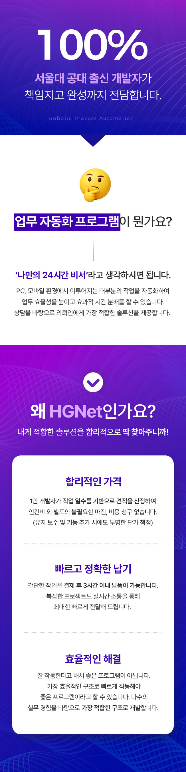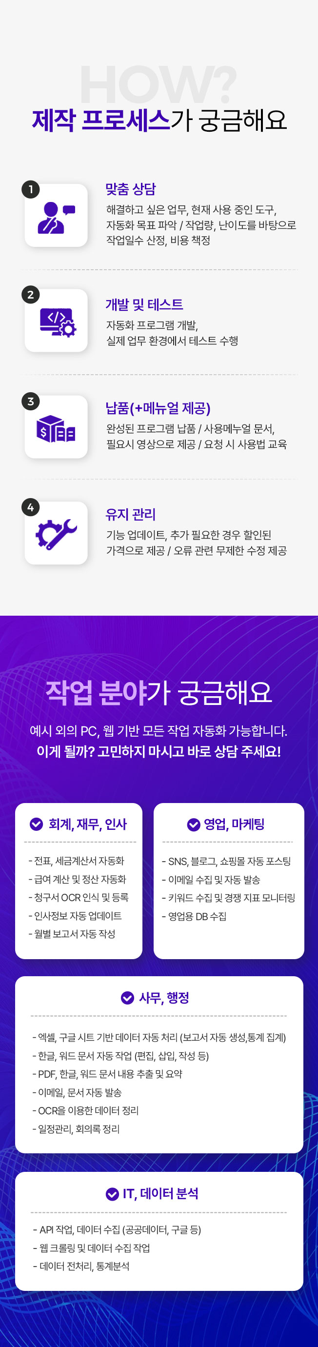 서울대 공대 출신 개발자가 책임지고 상담부터 완성까지 100% 전담합니다.개발 경력 4년차, 수행 프로젝트 다수업무 자동화 프로그램 개발PC, 모바일, 웹 환경에서 이루어지는 대부분의 작업을 자동화할 수 있습니다.n8n, Make, Zapier 작업도 가능합니다.정확한 상담을 바탕으로 의뢰인에게 가장 적합한 솔루션을 제공합니다.1️⃣ 합리적인 가격작업일수 기반 견적으로 불필요한 비용 청구 없습니다.1인 개발자로, 인건비만 산정하고 별도의 마진을 잡지 않습니다.유지보수 및 기능 추가 시에도 투명한 단가 책정을 통해 과도한 견적 드리지 않습니다.2️⃣ 빠른 납기간단한 작업은 결제 후 3시간 이내 납품 가능합니다.복잡한 프로젝트도 최대한 빠른 일정으로 완성합니다.의뢰인과 실시간으로 소통해 최대한 빠르게 전달해 드립니다.3️⃣ 효율적인 구조잘 작동하기만 하면 좋은 프로그램이 아닙니다.가장 효율적인 구조로, 빠르게 작동해야 좋은 프로그램입니다.다수의 실무 경험으로 해당 상황에 가장 적합한 구조로 개발합니다.4️⃣ 작업 분야예시 외의 PC, 웹에서 작업하는 모든 작업 자동화 가능합니다.이게 될까? 고민하지 마시고 바로 상담 주세요.1) 사무, 행정- 엑셀, 구글시트 기반 데이터 자동처리 (보고서 자동 생성, 통계 집계)- 한글, 워드 문서 자동 작업 (편집, 삽입, 작성 등)- PDF, 한글, 워드 문서 내용 추출 및 요약- 이메일, 문서 자동 발송- OCR을 이용한 데이터 정리- 일정관리, 회의록 정리2) 회계, 재무, 인사- 전표, 세금계산서 자동화- 급여 계산 및 정산 자동화- 청구서 OCR 인식 및 등록- 인사정보 자동 업데이트- 월별 보고서 자동 작성3) 영업, 마케팅- SNS, 블로그, 쇼핑몰 자동 포스팅- 이메일 수집 및 자동 발송- 키워드 수집 및 경쟁 지표 모니터링- 영업용 DB 수집4) IT, 데이터 분석- API 작업, 데이터 수집 (공공데이터, 구글 등)- 웹 크롤링 및 데이터 수집 작업- 데이터 전처리, 통계분석 1) 상담- 해결하고 싶은 업무, 현재 사용 중인 도구, 자동화 목표 파악- 작업량, 작업 난이도를 바탕으로 작업일수 산정, 비용 책정2) 개발 및 테스트- 자동화 프로그램 개발, 실제 업무 환경에서 테스트 수행3) 납품(+메뉴얼 제공)- 완성된 프로그램 납품- 사용 메뉴얼 문서, 필요시 영상으로 제공- 요청시 사용 방법 교육 진행4) 유지 관리- 기능 업데이트, 추가가 필요한 경우 할인된 가격으로 제공- 오류에 대해서는 무제한 수정 제공 원활한 개발과 남품을 위해 아래 자료를 준비해 주세요.- 업무 설명 자료 또는 흐름도- 사용 중인 프로그램 및 파일 형식- 샘플 데이터 (필요시)- 계정 및 접근 권한 (웹에서 작동하는 작업의 경우)