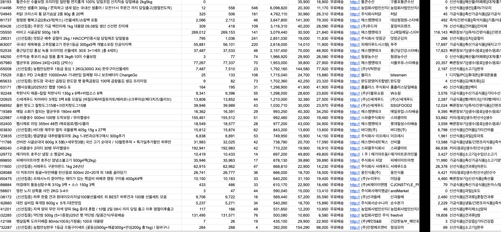 국내외 대형 오픈마켓 데이터 수집 전문가입니다.국내에서 가장 복잡한 구조를 가진 대형 커머스 사이트들의 상품 정보, 리뷰, 가격 데이터를 수집하는 솔루션을 다수 개발한 경험이 있습니다.24년 9월부터 수집을 시작하였으나 1년이 지난 현재에도 안정적으로 데이터를 수집중이며, 고객님이 원하시는 수집 주기에 맞추어 Google Spreadsheet로 올려드리고 있습니다.단순 텍스트, 이미지는 물론, 로그인이 필요한 페이지, 무한 스크롤, 동적(Ajax) 로딩으로 구성된 복잡한 웹사이트의 데이터까지 정확하게 수집하는 맞춤형 솔루션을 제공합니다.사이트 표면에 보이는 정보 외에도 숨겨진 값들도 확인해 드립니다. (잔여 수량 등)[수집 가능한 데이터]쇼핑몰: 상품명, 가격, 옵션, 리뷰, 평점, 이미지 URL공공데이터: 공공기관에서 제공하는 공개 정보 (출처 명시)커뮤니티/뉴스: 게시글 제목, 내용, 소통 내용, 작성자기타: 지도 좌표, 동영상, 각종 차트 데이터 등※ 본 서비스는 공개된 정보만을 수집하며, 저작권 및 이용약관을 준수합니다. ※ 타 서비스의 상업적 정보를 무단으로 재판매하는 용도로는 사용할 수 없습니다.[이런 분들께 강력 추천합니다]경쟁사 상품/가격 데이터를 매일 모니터링해야 하는 쇼핑몰 운영자/MD시장 트렌드, 고객 리뷰 분석이 필요한 마케터, 데이터 분석가방대한 자료 조사가 필요한 리서처 및 대학(원)생[제공 기술]Python 기반 (Selenium, nodriver, playwright, requests, BeautifulSoup 등)원하는 형식(Excel, CSV, JSON, DB)으로 깔끔하게 정제[옵션] 사용하기 쉬운 UI(GUI)가 포함된 업무 효율화 솔루션 제작 1. 작업 의뢰 아래 '의뢰인 준비사항'을 참고하여 문의 글을 남겨주세요.2. 견적 상담 및 결제 사이트 구조, 난이도, 작업량을 분석하여 수집 가능 여부, 개발 기간, 정확한 견적을 회신합니다. 견적 협의 후 의뢰인이 결제를 진행합니다.3. 맞춤 데이터 수집 솔루션 개발 요청하신 사양에 맞춰 데이터 수집 솔루션 개발을 진행합니다.4. 결과물 전달 및 검수 (전문가 의뢰인) 수집된 샘플 데이터 또는 개발된 솔루션을 전달하여 의뢰인이 검수합니다.5. 최종 파일 전달 및 거래 완료 (전문가 의뢰인) (수정이 필요한 경우) 수정 작업을 거쳐 최종 결과물(데이터 파일 또는 솔루션)을 전달합니다. 의뢰인이 구매 확정을 진행합니다.[옵션] 유지보수 (협의) 사이트 구조 변경 등으로 인한 정기적인 유지보수는 별도 협의 후 진행합니다. 1. 데이터 수집 대상 URL특정 검색 결과 페이지, 상품 상세 페이지, 게시판 등 정확한 주소(URL)가 필요합니다. (예: X마켓 '무선 이어폰' 검색 결과 상위 100개 상품)2. 필요한 데이터 항목 (구체적일수록 좋습니다)수집을 원하는 데이터 항목을 명확하게 알려주세요. (예: 상품명, 할인가, 원가, 리뷰 수, 평점, 썸네일 이미지 주소)3. 원하는 결과물 형식데이터를 어떤 파일 형태로 받기 원하시나요? (예: Excel, CSV, JSON, Google 스프레드시트 등)[선택] 기타 요청 사항(예: 로그인이 필요합니다 / 매일 1회 실행이 필요합니다 / 리뷰 50개 이상인 상품만 수집해 주세요)