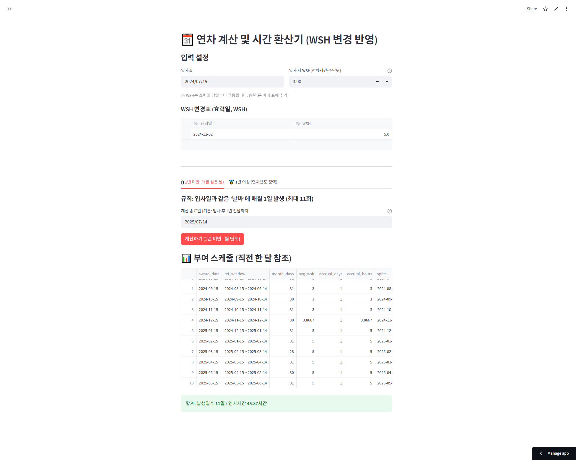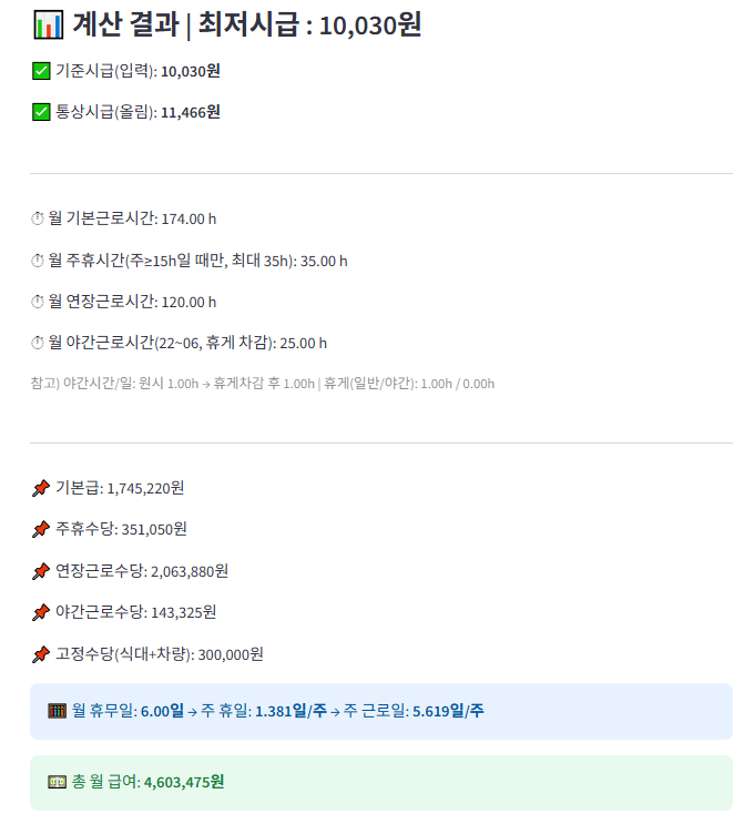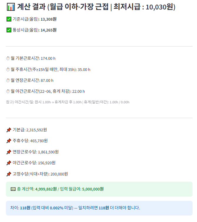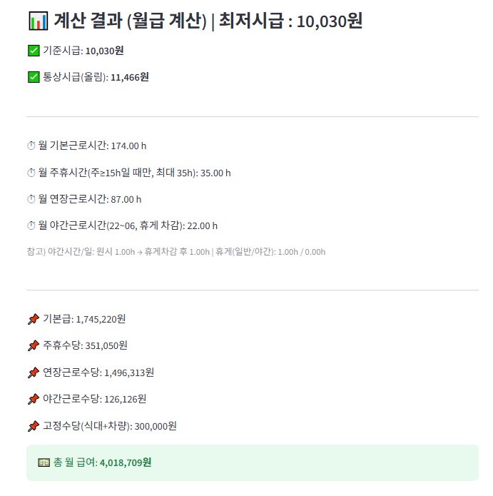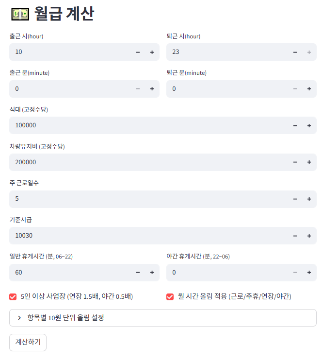 [기능 세줄 요약]1. 시급·월급 자동 역산/계산: 월급·근로패턴을 입력하면 연장·야간·주휴 포함 ‘실 기준시급’과 총 월급을 자동 계산.2. 자동 시간 산출: 휴게·연장·야간·주휴시간을 자동 감지·계산하고 단위별 올림 옵션 제공.3. 연차·근로일 역산: 월 휴무일 기반 월급 계산 및 근무시간 변동 반영 연차 일수·시간 자동 산출. 1️⃣ 컨택 (요청 접수 및 협의)의뢰인이 크몽에서 서비스 문의/구매2️⃣ 비용 처리 (결제 및 진행 확정)크몽 내에서 서비스 결제 완료3️⃣ 접근 권한 허용 및 세팅사용자가 접속할 URL 안내로그인/접근 방식 및 사용법 간단 매뉴얼 제공내부 시스템 연동 또는 커스텀 환경이 필요한 경우* 한달 무료 사용을 제공하고 있습니다. 관심이 있으신 분들은 1:1 문의하기를 통해 문의해주세요~ 의뢰인 준비사항- 이메일주소 (서비스 접근 권한을 허용하기 위해서 필요합니다~)이외에는 준비사항이 따로 없습니다^^
