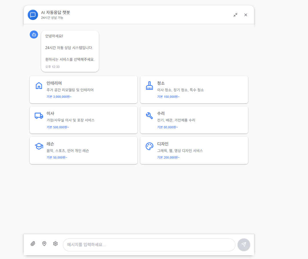 고객님의 업무·비즈니스 환경에 맞춘 맞춤형 GPT 챗봇을 제작해드립니다.사용하시는 문서·업무 프로세스·FAQ·정책 등을 기반으로정확한 답변을 제공하며, 검색·요약·분류 기능도 필요에 따라 적용 가능합니다.2인 개발팀이 직접 기획·개발·테스트까지 진행하며불필요한 템플릿 사용 없이 고객 상황에 맞는 완전 커스텀 챗봇을 제공합니다.개발 후 작동 안정성 점검, 기본 사용법 안내도 함께 제공해초보자도 바로 사용할 수 있도록 세팅해드립니다. 요구사항 확인– 챗봇 목적, 데이터 종류, 원하는 톤·기능 확인초기 시제품 제공– 기본 대화 흐름·기능 동작 테스트 버전 전달최종 개발 및 기능 완성– 문서 기반 검색/요약, QA 적용, 프롬프트 튜닝 진행검수 및 수정 반영– 패키지 기준 수정 횟수 내에서 상세 조정 진행최종 전달 및 설치 안내– 설치 파일 / URL 전달 및 사용 가이드 제공 챗봇 제작을 위해 아래 자료를 준비해주시면 작업이 더 빠르고 정확하게 진행됩니다.1) 챗봇 목적 및 사용 시나리오(어떤 용도로 사용할지)2) 참고할 문서, FAQ, 규정, 정책, 상품 정보 등3) 원하는 기능(검색/요약/답변 톤/추가 API 연동 여부)4) 사용할 OpenAI API Key 또는 사용할 모델 종류5) 웹사이트에 설치할 경우, 서버/호스팅 정보 또는 연동 방식 안내