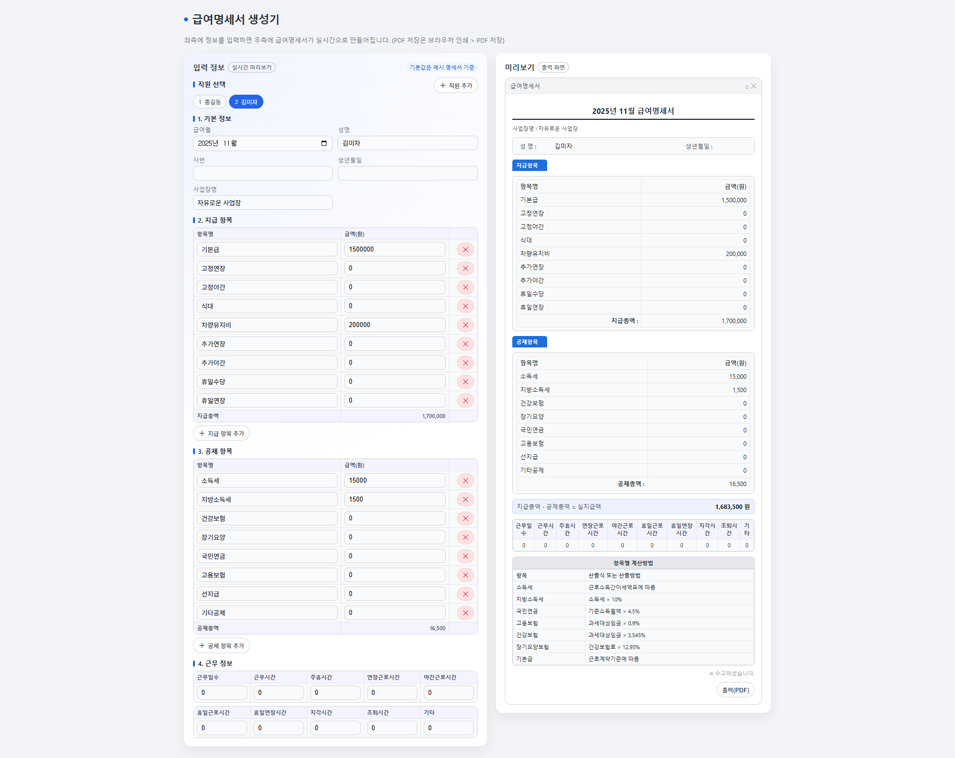 매달 지급해야 되는 급여명세서를 쉽고 간단하게 작성해서 전달드려보세요.이런 분들이 사용하면 좋습니다.- 엑셀에 어려움을 겪고 계신 분- 초보 사업주분- 급여명세서 양식이 필요하신 분 1️⃣ 컨택 (요청 접수 및 협의)의뢰인이 크몽에서 서비스 문의/구매2️⃣ 비용 처리 (결제 및 진행 확정)크몽 내에서 서비스 결제 완료3️⃣ 접근 권한 허용 및 세팅사용자가 접속할 URL 안내로그인/접근 방식 및 사용법 간단 매뉴얼 제공내부 시스템 연동 또는 커스텀 환경이 필요한 경우* 소상공인/자영업자분들에게는 무료로 배포하고 있습니다~! 문의 남겨주세요^^ 의뢰인 준비사항- 이메일주소 (서비스 접근 권한을 허용하기 위해서 필요합니다~)이외에는 준비사항이 따로 없습니다^^