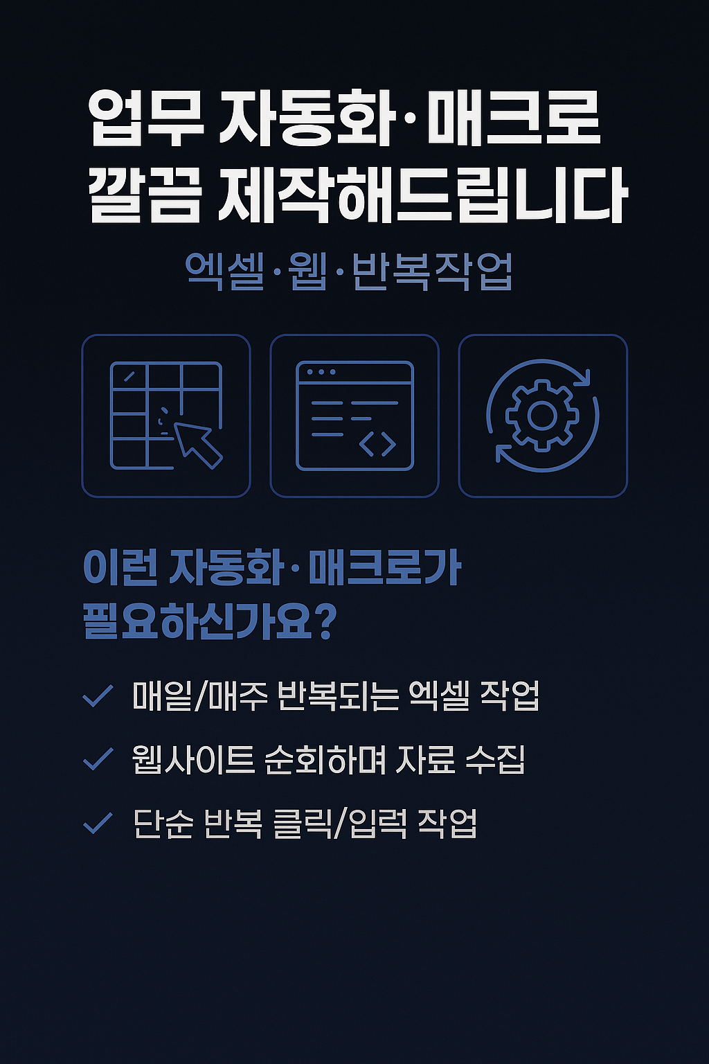 이런 자동화·매크로가 필요하신가요?매일/매주 똑같은 엑셀 작업을 복붙하고 있나요?여러 사이트 들어가서 로그인 검색 복사 붙여넣기… 같은 일을 반복하고 있나요?단순 반복 클릭/입력 작업 때문에 시간만 잡아먹고 있나요?이런 반복 업무를 파이썬 기반 자동화 프로그램·매크로로버튼 한 번 클릭에 끝낼 수 있게 도와드립니다. 제가 제공하는 자동화 / 매크로 유형요청하실 수 있는 대표적인 작업 유형은 다음과 같습니다.오피스(엑셀·한글·PPT) 자동화엑셀 데이터 정리, 필터링, 통계/집계 자동화양식에 맞춰 자동 보고서 생성 (예: 일간/주간 리포트)반복되는 복사·붙여넣기·서식 지정 작업 자동화웹 사이트 자동화 / 매크로자동 로그인, 예약, 신청, 폼 입력특정 조건에 맞는 항목 자동 조회 및 정리관리자 페이지 반복 업무(등록/수정/검수 등) 자동화쇼핑몰/커뮤니티/블로그/뉴스 등에서 자료 자동 수집상품 정보, 리뷰, 게시글, 댓글 등 수집 후 엑셀/CSV로 정리키워드별 데이터 수집 및 분석용 데이터셋 제작마케팅·업무 보조 자동화같은 메시지/이메일을 여러 대상에게 순차 발송(플랫폼 정책 허용 범위 내)SNS/커뮤니티 모니터링 및 정리 자동화간단한 리포트, 통계 수치 자동 계산기타 자동화 프로그램PC 상에서 반복되는 마우스/키보드 입력 매크로특정 조건이 되면 알림 띄우기, 정해진 시간에 프로그램 실행 등위에 없는 내용이라도,“이런 반복 작업도 자동화가 될까요?” 라고 편하게 문의 주시면가능 여부부터 솔직하게 말씀드리겠습니다. 서비스 특징파이썬 기반 자동화·매크로 제작요구사항을 꼼꼼히 정리 프로토타입 공유 최종 수정의 흐름으로 진행단순 작동이 아니라, 내가 매일 쓰기 편한지를 기준으로 UI/흐름 구성일정 기간 내 무상 오류 수정(명확한 버그의 경우) 1. 문의 및 상담하시고 싶은 작업을 편하게 말씀 주세요.“말로 설명만” 해주셔도 괜찮고, 있으면 더 좋은 자료는:현재 하고 계신 작업 캡처 화면간단한 동영상(작업 과정을 녹화)예시 엑셀/파일, 참고 사이트 링크2. 요구사항 정리 & 견적 안내대화 내용을 바탕으로 제가 정리해서 “이 작업을 이렇게 자동화하겠습니다” 라고 설명드립니다.기능 범위와 예상 작업 시간에 따라 최종금액 & 예상 기간을 안내드립니다.3. 개발 진행합의된 내용 기준으로 자동화 프로그램·매크로 제작을 진행합니다.필요 시 중간 단계 결과를 캡처/영상 등으로 공유드립니다.4. 납품 및 사용 안내실행 파일(.exe) 또는 파이썬 스크립트 등, 합의된 형태로 전달드립니다.사용 방법을 텍스트·캡처 또는 간단한 영상으로 안내드릴 수 있습니다.5. 오류 수정 및 마무리전달된 버전에서 명확한 오류/버그가 발생하면 정해진 기간 동안 무상 수정해드립니다.추가 기능/요구 사항은 별도 비용으로 상담 후 진행 가능합니다. 가능하면 아래 내용을 준비해 주시면 작업이 훨씬 빨라집니다.“현재 수작업으로 하고 있는 과정”을 최대한 자세히 설명(ex. 1) 엑셀 열기 2) A열에서 “완료”인 행만 필터 3) B열 값만 복사해서 다른 시트에 붙여넣기…)사용 중인 엑셀/문서 샘플 파일자동화에 사용할 웹사이트 주소 및 테스트용 계정(필요한 경우)결과물이 어떤 형태(엑셀, CSV, 텍스트, 메신저 전송 등)이면 좋을지용어가 어려우셔도 괜찮습니다.“평소 하시던 대로 설명해 주시면, 제가 자동화 관점에서 다시 정리해 드립니다.”
