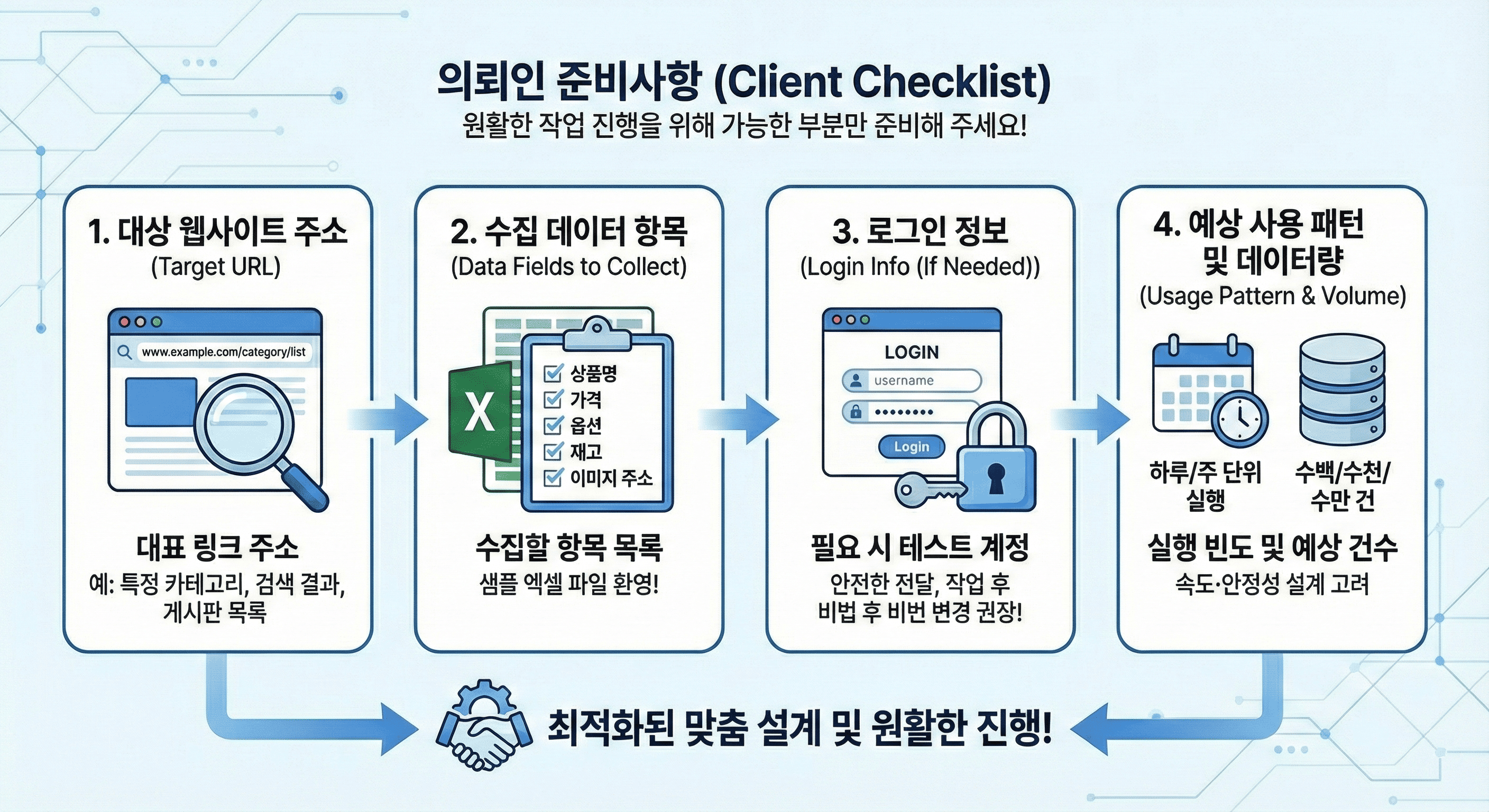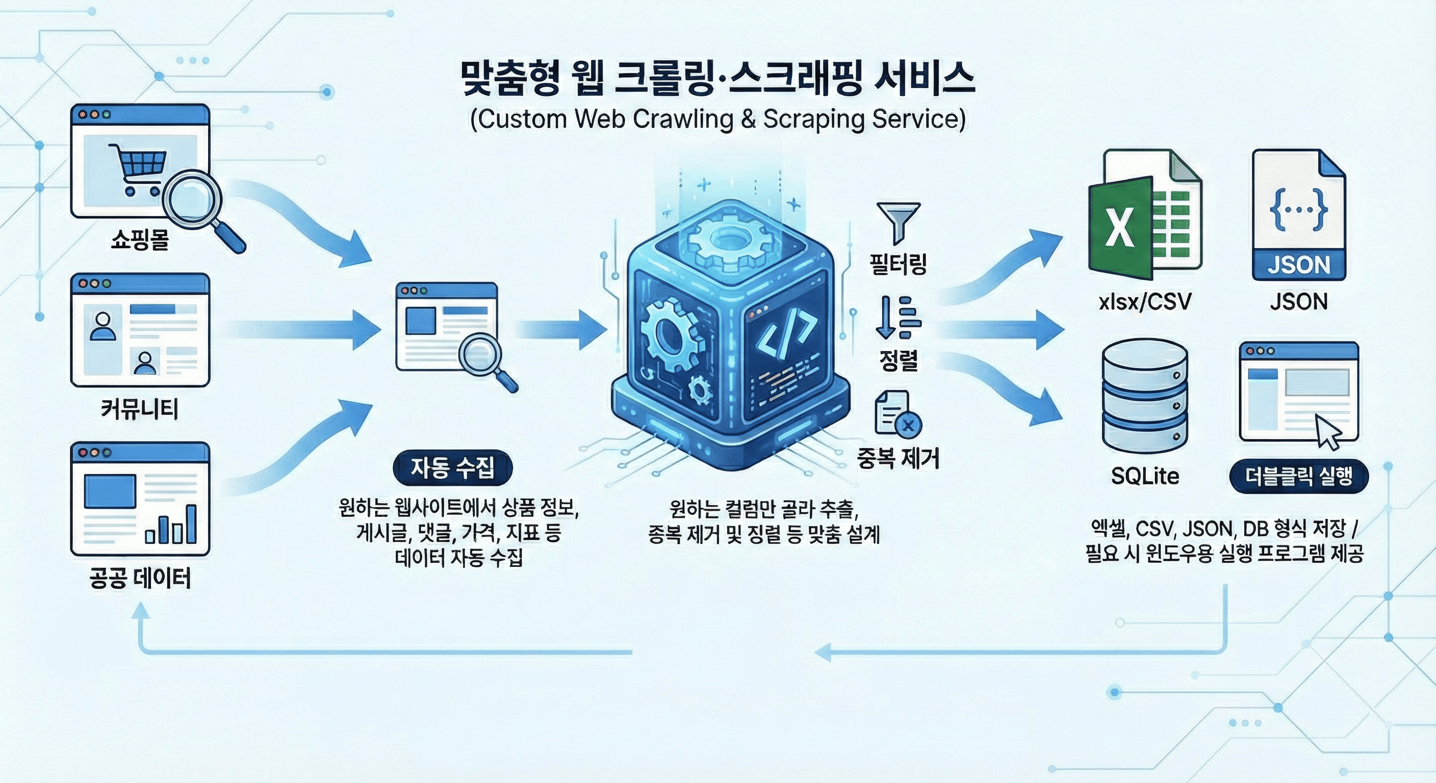 반복해서 수동으로 데이터를 복사·붙여넣기 하고 계신가요?이 서비스는 원하는 웹사이트에서 상품 정보, 게시글, 댓글, 가격, 지표, 링크 등 각종 데이터를 자동으로 수집·정리해 드리는 맞춤형 크롤링·스크래핑 제작 서비스입니다.단순히 “데이터를 긁어오는” 수준이 아니라, 실제 업무에 바로 활용할 수 있도록 아래와 같이 설계합니다.원하는 컬럼만 골라 추출 (예: 제목, 가격, 재고, 링크 등)엑셀(xlsx) / CSV / JSON / 간단한 DB(SQLite) 형식 저장필요 시 중복 제거, 정렬, 간단한 필터링 로직 반영로그인·검색 조건·카테고리 등 다양한 조합으로 수집정기 수집(스케줄링)이나 버튼 클릭 실행 등 사용 패턴에 맞춘 구조 설계원하실 경우, 윈도우용 간단한 실행 프로그램(UI) 형태로 제작해 드려서, 비전문가도 아이콘 더블클릭 후 버튼만 눌러 사용할 수 있도록 도와드립니다. 데이터 파일은 바로 엑셀로 열어보고, 기존 업무 파일과 쉽게 연결할 수 있도록 구성합니다.고객님의 비즈니스가 장기적으로 안전하게 운영될 수 있도록, 기술적인 부분뿐 아니라 리스크도 함께 고려합니다.이 서비스를 통해 할 수 있는 대표적인 활용 예시는 다음과 같습니다.•쇼핑몰·오픈마켓 상품 정보/가격·할인율 수집 및 비교•경쟁사 상품/이벤트/가격 정책 모니터링 데이터 구축•커뮤니티·카페·블로그 게시글/댓글 수집 후 키워드 분석용 데이터 만들기•공공/지표 사이트에서 특정 항목만 뽑아 일 단위 리포트 자동화자신이 운영하는 사이트의 로그/리스트를 정리하는 보조 크롤러 제작“아이디어는 있는데, 어떻게 구현해야 할지 모르겠다” 하셔도 괜찮습니다.원하시는 목적과 대략적인 예시만 알려주시면, 구현 가능 여부·방식·대략적인 데이터 구조까지 함께 제안드리며, 실제로 업무 효율을 올리는 방향으로 설계해 드립니다. 초기 문의 및 목표 파악 먼저 어떤 사이트에서, 어떤 데이터를, 어떤 용도로 사용하실 계획인지 여쭤봅니다.“어떤 페이지에서 어떤 정보가 필요하다” 정도만 말씀해 주셔도 되고,캡처 이미지나 직접 만든 엑셀 샘플이 있다면 함께 보내주시면 더 정확하게 파악할 수 있습니다.사이트 구조·기술적 검토 요청해 주신 사이트가로그인 필요 여부무한 스크롤/페이지네이션 구조로봇 차단(보안문자, 강한 anti-bot 등)약관/법적 이슈를 고려했을 때 구현 가능한 범위인지 검토합니다. 이 단계에서 어떤 부분은 가능하고, 어떤 부분은 제한이 있을 수 있는지 솔직하게 안내드립니다.견적·패키지 확정 및 결제 난이도와 작업량에 따라 STANDARD/DELUXE/PREMIUM 중 적합한 패키지를 추천드리거나,필요한 경우 옵션을 추가해 맞춤 구성을 제안드립니다.작업 범위(수집 항목, 페이지 수, 파일 형식, UI 여부)를 정리한 뒤 결제 후 개발을 시작합니다.크롤링 로직 설계 및 개발 실제 웹 페이지 HTML 구조·API 응답 등을 분석해,필요한 데이터만 안정적으로 가져오는 크롤러를 구현합니다.이 과정에서 요청 속도 제한, 예외 처리, 에러 로그 등을 함께 설계해실사용 환경에서도 안정적으로 동작할 수 있도록 신경 씁니다.중간 점검 및 1차 결과 공유 일정량의 데이터를 먼저 수집해 샘플 파일(엑셀/CSV 등)로 전달드리고,컬럼 구성·데이터 해석에 문제가 없는지 함께 확인합니다.필요하면 이 단계에서 컬럼명 변경, 불필요 데이터 제거, 추가 필드 요청 등을 조정합니다.최종 결과물 전달 및 사용법 안내 스크립트/프로그램 파일실행 방법 및 간단 설명을 함께 제공해 드립니다.UI가 포함된 패키지의 경우, 캡처와 함께 간단 매뉴얼을 작성해 드려 처음 사용하시는 분들도 어렵지 않게 사용할 수 있도록 안내합니다.사후 수정·보완(수정 횟수 내) 및 유지보수 협의 약속된 수정 횟수 내에서, 버그 수정 및 경미한 로직 조정은 무상으로 진행합니다.사이트 구조가 크게 변경되거나, 새로운 페이지·사이트를 추가하고 싶으신 경우에는별도 유지보수/확장 작업으로 협의 후 진행해 드립니다. 대상 웹사이트 주소(URL)예: 특정 카테고리, 검색 결과, 게시판 목록, 상세 페이지 등“어디에서부터 데이터를 모으면 되는지”를 알 수 있게 대표 링크를 알려주세요.수집하고 싶은 데이터 항목 목록예: 상품명 / 가격 / 옵션 / 재고 / 링크 / 이미지 주소 / 작성자 / 날짜 / 조회수 등이미 사용 중인 엑셀 양식이 있다면 샘플 파일을 주셔도 됩니다.로그인 방식 및 계정 정보(필요한 경우만)동의하시는 경우에 한해 테스트용 계정을 제공해 주시거나,프로그램 실행 시 직접 로그인할 수 있는 형태로도 설계 가능합니다.민감 정보는 최대한 안전하게 전달해 주시고, 작업 후 비밀번호 변경을 권장드립니다.예상 사용 패턴 및 데이터량하루/주 단위로 몇 번 정도 실행할 예정인지대략 몇 건(수백/수천/수만 건) 정도 수집할지 알려주시면속도·안정성을 고려한 구조로 설계하는 데 도움이 됩니다.