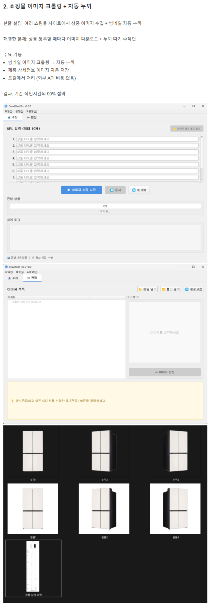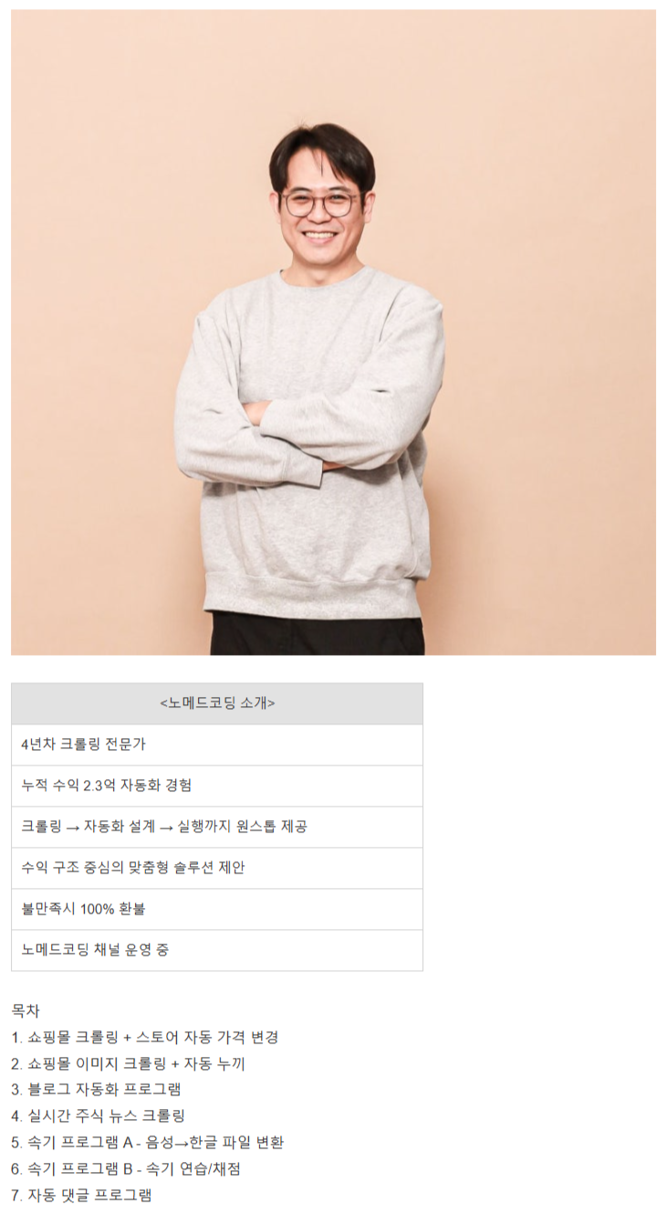 자동화 시스템으로 직접 2.4억원 수익을 낸 개발자입니다.쇼핑몰 운영자, 온라인 셀러분들의 반복 작업을 자동화해드립니다.[이런 분들께 추천합니다]- 경쟁사 가격을 매일 확인하느라 시간 쓰시는 분- 상품 정보 수집에 지치신 분- 이미지 다운로드, 누끼 따기 수작업 하시는 분- 데이터는 필요한데 어디서 어떻게 가져와야 할지 모르시는 분[제작 경험]- 쇼핑몰 가격 크롤링 + 쇼핑몰 자동 가격 변경- 쇼핑몰 이미지 크롤링 + 자동 누끼- 실시간 주식 뉴스 크롤링 (1초 이내 수집)- 블로그 자동화 (상위노출 분석 + 자동 글쓰기)[작업 가능 범위]- 모든 웹사이트 데이터 수집- 결과물: 엑셀, CSV, DB 저장, 이미지 저장- 반복 실행 가능한 프로그램 제작- 윈도우 환경 가능"이것도 되나요?" 싶은 것도 편하게 물어봐 주세요.빠른 응답, 끝까지 책임지고 작업합니다. 1. 상담원하시는 작업 내용을 편하게 말씀해주세요.기술적으로 가능한지, 어떤 방식이 좋을지 안내드립니다.내용 확인 후 견적과 일정을 안내드립니다.2. 작업작업 중 진행상황 공유드립니다.이슈 발생 시 바로 연락드립니다.3. 납품작업 완료 후 결과물 전달 + 사용법 안내드립니다.혼자서도 사용할 수 있도록 설명드립니다.4. 수정결과물 확인 후 오류나 누락 있으면 말씀해주세요.빠르게 수정해드립니다. [크롤링 의뢰 시]- 수집할 사이트 주소- 수집할 데이터 항목 (스크린샷이나 예시 있으면 좋습니다)- 원하는 결과물 형태 (엑셀, CSV, 프로그램 등)[프로그램 제작 의뢰 시]- 원하는 기능 설명- 참고할 프로그램이나 예시 (있으면)잘 모르셔도 괜찮습니다.상담하면서 같이 정리해드립니다.