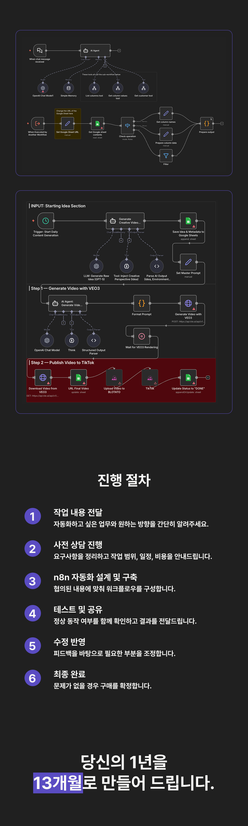 [선착순 5명 / 조기 종료 가능] 런칭 기념 한정 이벤트!리뷰가 쌓이기 전, 지금 이 글을 보시는 분들께만 드리는 3가지 '얼리버드 혜택'을 드립니다!혜택 1. 런칭 기념 파격 할인:실력 증명을 위해 마진을 포기했습니다. 리뷰 5개 달성 시 즉시 정상가로 인상됩니다.- STANDARD: 19만 원 -> 11.9만 원- DELUXE: 49만 원 -> 36만 원혜택 2. n8n 셀프 호스팅 무료 제공: 10만 원 상당의 [원격 로컬 호스팅 + 서버 도메인 설정]을 무상으로 지원해 드립니다. - n8n 클라우드 구독료 월 약 3.4만원 -> 평생 0원 (6개월만 써도 20만 원 이상 이득)- 도메인 구매 비용 별도 (선택사항)혜택 3. 사후 관리 가이드세팅하고 끝이 아닙니다. 직접 유지보수하실 수 있도록 가이드를 드립니다.- 알림 문구 변경- 조건 값 수정- 기본 흐름 이해 및 유지 관리---매일 반복되는 업무, 아직도 직접 하고 계신가요?메일을 확인하고,엑셀과 노션을 오가며 데이터를 정리하고,같은 내용을 플랫폼마다 다시 작성해 올리고,업로드가 잘 됐는지 또 한 번 확인하는 일들.하나하나는 사소하지만,이런 작업이 하루를 조금씩 갉아먹고 있진 않나요?이 작업에 하루 1시간 씩 쓰고 있다면숫자로 보면 생각보다 큰 시간입니다.하루 1시간 × 한 달 20일 = 월 20시간하루 1시간 × 1년 = 약 240시간-> 1년에 무려 한 달(30일) 이상의 시간을 '단순 반복 업무'에만 쏟고 있는 셈입니다.남들이 1년에 12개월을 살 때, 자동화를 구축한 당신은 '13개월'을 살 수 있습니다.이 시간을 매출을 만드는 핵심 업무에 쓰거나, 온전한 휴식에 쓸 수 있다면 어떨까요?n8n을 활용하면 이 모든 반복 작업을 시스템이 대신합니다.업무는 자동으로 돌아가고, 대표님은 더 가치 있는 일에만 집중하세요.[ 실제로 이런 자동화가 가능합니다 ]업무 자동화 예시- 구글 폼 응답을 노션 또는 구글 시트에 자동 저장- 예약 및 신청 데이터 자동 정리 후 알림 발송- 특정 조건 발생 시 이메일, 슬랙, 텔레그램 자동 알림- 매일 정해진 시간에 데이터 수집 및 리포트 생성AI 자동화 예시- 고객 문의 이메일을 분석해 GPT 1차 답변 초안 생성- 입력된 텍스트 요약, 분류, 변환- 콘텐츠 아이디어 자동 생성- 데이터 기반 문서 자동 작성SNS / 마케팅 자동화- 노션에 작성한 글을 X, Threads, 인스타그램에 자동 업로드- 콘텐츠 업로드 후 링크 정리 및 기록- 반복적인 마케팅 작업 자동 처리단순 자동화부터AI와 마케팅을 결합한 고급 자동화까지필요한 수준에 맞게 설계해드립니다.[ 이런 분들께 추천드립니다 ]- 반복 업무에 많은 시간을 쓰고 있는 1인 사업자, 프리랜서- 노션이나 구글 시트를 사용 중이지만 자동화는 어려운 분- 고객 문의나 데이터 정리가 많아 업무 효율이 필요한 분- AI를 업무에 활용하고 싶지만 연결 방법을 모르는 분- 자동화가 가능한지 확신이 없는 분기획 단계부터 함께 도와드립니다.[ 왜 n8n인가요? ]- 특정 툴에 종속되지 않는 유연한 자동화- Google, Notion, Slack, Email, SNS, AI까지 폭넓은 연동- 필요 시 셀프 호스팅으로 평생 무료 사용 가능[ n8n 클라우드 vs 셀프 호스팅 ]- n8n 클라우드 유료 플랜: 월 20유로 (약 3.4만원)- 셀프 호스팅 옵션 (추가금 5만원) : 한 번 설치로 평생 무료로 사용 가능6개월만 사용해도 약 20만 원 이상 비용을 절약할 수 있습니다.[ 처음이라도 괜찮습니다 ]자동화가 가능한지 모르겠다면어떤 서비스부터 연결해야 할지 헷갈린다면API나 계정 설정이 어렵다면주문 전 무료 사전 상담을 통해가능 여부부터 설계 방향까지 안내드립니다.부담없이 문의 넣어주세요 ! 1. 작업 내용 전달자동화하고 싶은 업무와 원하는 방향을 간단히 알려주세요.2. 사전 상담 진행요구사항을 정리하고작업 범위, 일정, 비용을 안내드립니다.3. 자동화 구축협의된 내용에 맞춰 워크플로우를 구성합니다.4. 테스트 및 공유정상 동작 여부를 함께 확인하고 결과를 전달드립니다.5. 수정 반영피드백을 바탕으로 필요한 부분을 조정합니다.6. 최종 완료문제 없을 경우 구매 확정을 부탁드립니다. 1. 자동화 내용자동화하고 싶은 업무를 간단히 설명해주세요.현재 수작업 방식, 사용하는 툴, 작업 빈도 등을 알려주시면 도움이 됩니다.(예: 구글 폼 데이터를 노션에 저장, 고객 문의 메일 GPT 자동 답변, SNS 콘텐츠 자동 업로드 등)2. n8n 클라우드 계정 및 연동 서비스 계정- n8n- Google / Notion / Slack / Telegram / Email / Meta 등※ 작업을 위해 접근 권한 또는 API 설정이 필요할 수 있습니다.※ 클라우드 비용 및 API 사용 요금은 실제 사용량 기준으로 별도 부과됩니다.3. (선택) 원격 셀프 호스팅 세팅셀프 호스팅 옵션을 선택하신 경우크롬 원격 데스크탑을 통해 설치를 진행합니다.