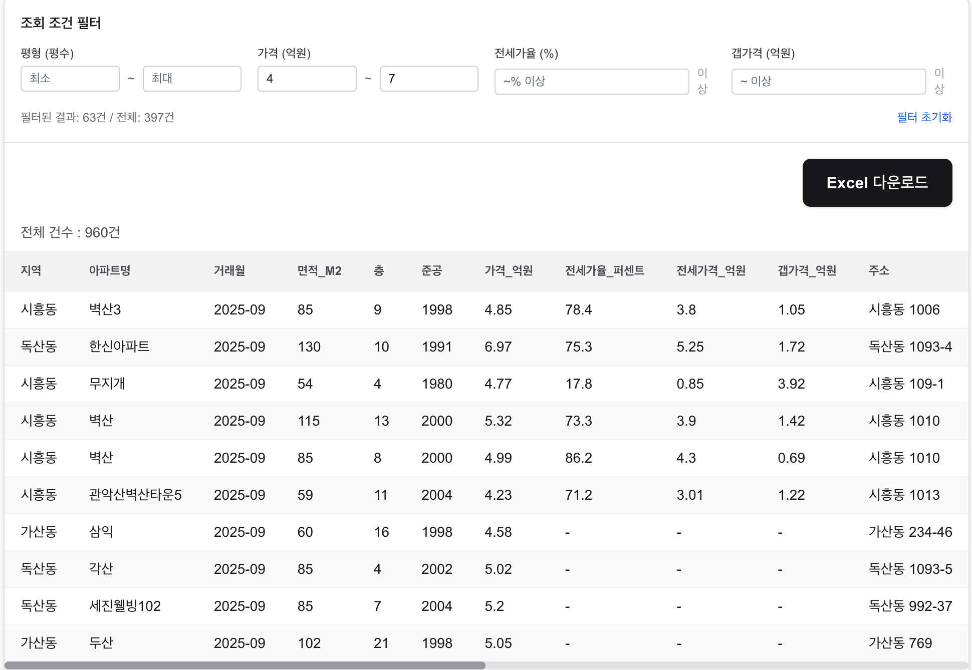 이 자료는 아파트·빌라·건물 갭투자를 분석하는 투자자 및 부동산 실무자를 위해실거래 데이터를 엑셀 하나로 정리한 분석용 데이터 시스템입니다.지역, 아파트명, 면적, 층, 준공년도, 매매가격, 전세가격, 전세가율, 갭가격 등투자 판단에 필요한 핵심 정보를 체계적으로 정리하여엑셀에서 정렬·필터·비교 분석을 바로 수행할 수 있습니다.매번 실거래가를 따로 조회하고, 전세가율과 갭가격을 직접 계산하던 번거로운 과정을한 번에 확인 가능한 구조로 만들어 매물 분석 시간과 반복 업무를 크게 줄여줍니다.부동산 중개업소, 개인 투자자, 매입 담당자 등실무에서 바로 활용할 수 있도록 가공된 데이터로,초보자부터 실무자까지 부담 없이 사용할 수 있습니다.또한, 기본 엑셀 자료 외에도원하시는 조건과 업무 방식에 맞춰 맞춤형 엑셀 또는 프로그램 제작도 가능합니다.(자동 계산, 조건 필터링, 데이터 정리·분석 기능 등)부동산 데이터는 정부24 공공 API에서 제공받는 데이터를 기반으로 가공된 데이터입니다. 1️⃣ 사용자 요청 접수서비스 구매 후 필요한 자료에 대해 요청을 접수합니다.2️⃣ 원하는 조건 입력지역, 기간, 면적, 가격대 등 사용자 맞춤 조건을 전달받습니다.3️⃣ 엑셀 파일 정리요청 조건에 맞춰 실거래 데이터를 정리하고 엑셀 파일로 가공합니다.4️⃣ 파일 발송 완료완성된 엑셀 파일을 전달드립니다.5️⃣ 구매 확정자료 확인 후 구매 확정을 진행합니다. 원하는 조건지역(시/구/동)거래 유형(매매 / 전세)기간(거래월 기준)면적, 가격대 등 분석에 필요한 조건활용 목적갭투자 분석매물 선별중개업소 실무 활용 등커스텀 제작 여부기본 엑셀 자료 제공엑셀 자동화(계산식, 필터, 정렬 등)맞춤형 프로그램 제작 여부추가 요청 사항(선택)특정 지표 추가데이터 구성 방식 변경기타 실무에 필요한 기능