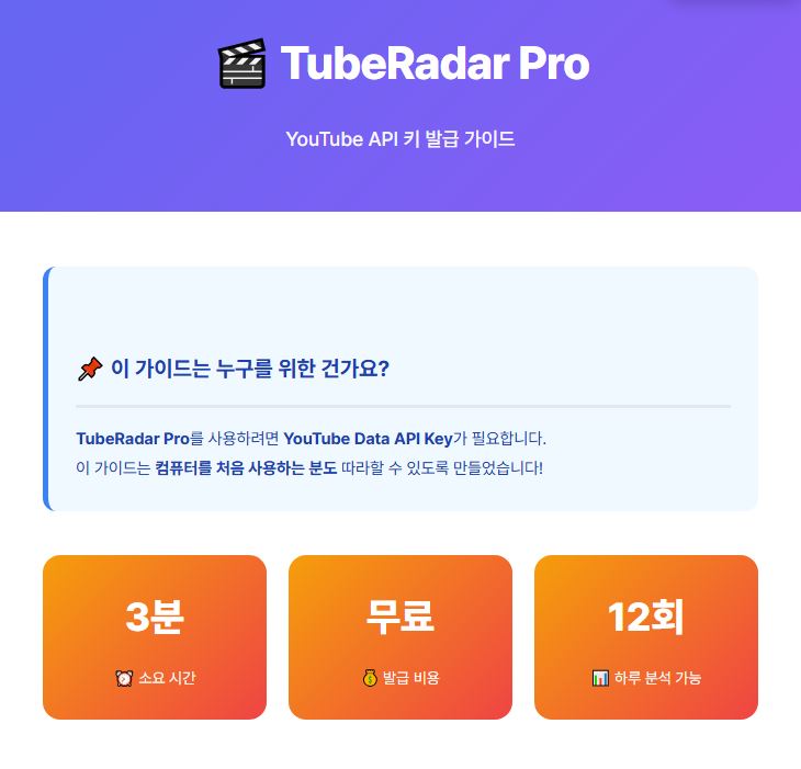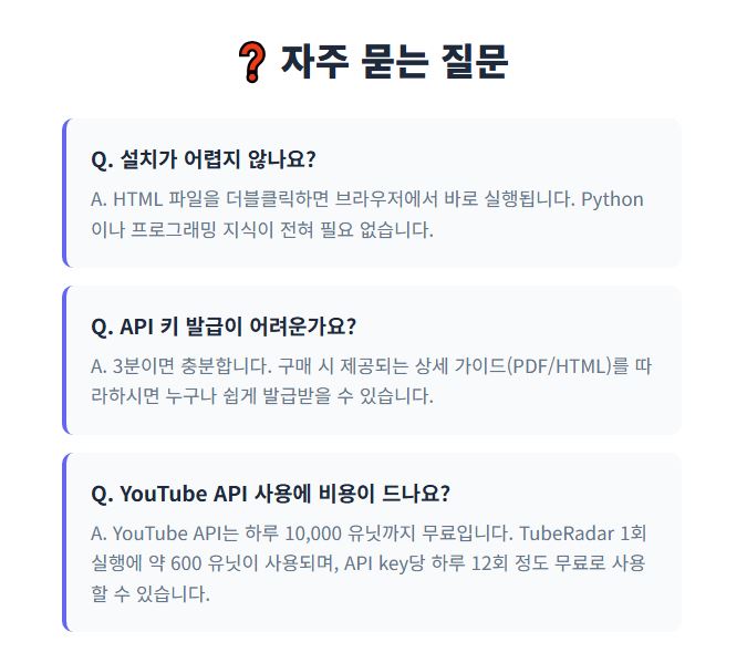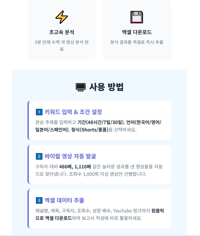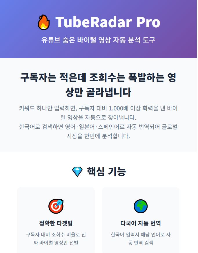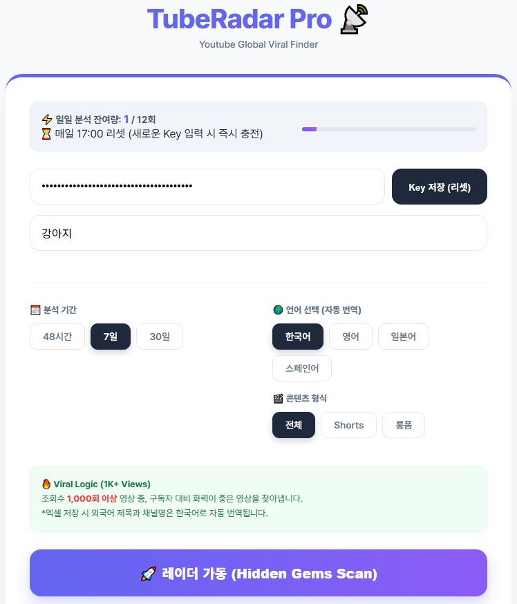 [10초 컷] 유튜브 글로벌 떡상 탐지기: TubeRadar Pro "열심히 만든 영상, 왜 내 것만 조회수가 안 나올까?"아직도 감으로 주제를 정하시나요?이제 데이터로 알고리즘의 정답지를 읽어보세요! 이런 분들은 무조건 '결제' 버튼을 누르세요!어떤 주제로 영상을 만들지 매일 3시간씩 고민하는 분구독자는 적은데 조회수만 폭발하는 '떡상 치트키'가 궁금한 분미국, 일본 등 해외 인기 소재를 누구보다 빠르게 선점하고 싶은 분벤치마킹 리스트 정리에 지친 자동화 채널 운영자분 TubeRadar Pro만의 '3가지 차별점'1. 숨겨진 보석 사냥 (Hidden Gem Scan) 단순 조회수 순위는 의미 없습니다.[구독자 대비 조회수 N배] 로직을 통해, 작은 채널이 대형 채널을 이긴 '진짜 실력 있는 콘텐츠'만 골라냅니다.2. 클릭 한 번으로 글로벌 트렌드 역수입 한국어로 입력하세요. 프로그램이 알아서 영어, 일본어, 스페인어로 번역하여 현지 떡상 영상을 추적합니다. 언어 장벽 없이 전 세계의 블루오션을 내 눈앞으로 가져오세요.3. 하이퍼링크 포함 전문가용 엑셀 리포트 분석 결과는 10초 만에 엑셀로 자동 변환됩니다. 썸네일, 영상 링크, 채널 링크까지 포함되어 있어 즉시 클릭하며 분석할 수 있습니다. 주요 기능 요약기간 필터: 48시간(급상승), 7일, 30일 타겟팅형식 구분: 롱폼과 쇼츠(Shorts) 개별 분석 지원자동 번역: 제목과 채널명까지 한국어로 매끄럽게 번역된 엑셀 제공쿼터 프리: API 키 교체로 할당량 걱정 없는 스캔 가능 제품 구매후 바로 제공해 드립니다 !혹시 문제가 되실경우, 최대 12시간 이내 제공해 드립니다.1. 유튜브 글로벌 떡상 분석기 : TubeRadar Pro 파일2. 초간단 API 입력방법 및 프로그램 적용 방법 가이드 PC 또는 노트북이 있으신가요 ?그럼, 별도 준비사항은 없습니다. 어려우시면 문의 주세요 !