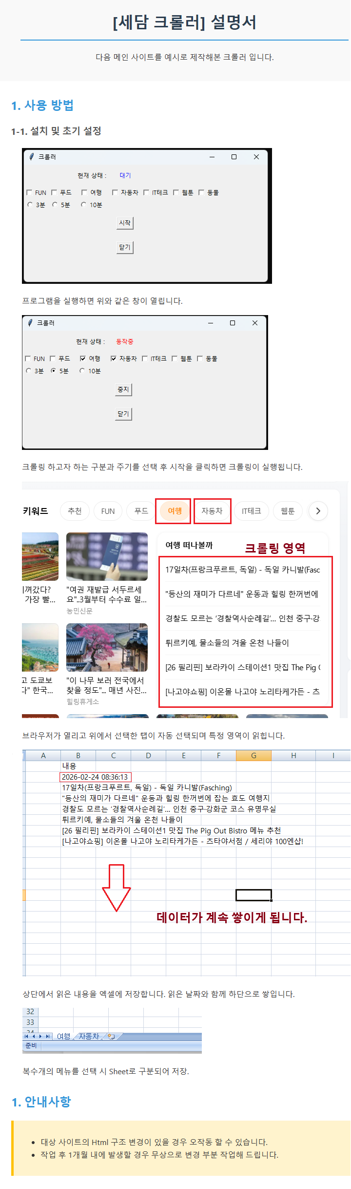 개발자 새담입니다.다년간의 웹, 앱 개발 경험을 바탕으로 탄탄한 결과물을 제공해드리려고 합니다.파이썬을 이용해 웹사이트를 크롤링 해드립니다.◦ 특정 게시판에 게시물이 생성 됐는지 여부 혹은 내용.◦ 쇼핑몰의 상품 정보.◦ 로그인 후 확인할 수 있는 페이지 자동 로그인 기능.◦ 게시판의 경우 검색어 및 검색조건 자동 입력. 다양한 웹사이트 정보를 읽어서 파일로 만들어 드립니다. 작업 후 한 달 내에 대상 사이트 변경으로 인한 문제 발생 시 무료 수정. 원하시는 결과의 변동 사항 등에 대해서는 1회 무상 지원 ※ 오픈 이벤트로 저렴하게 작업해 드리고 있습니다. ※ 크롤링의 경우 작업 후 추후 유지 보수가 중요합니다. 작업 후에도 저렴한 비용으로 쾌적하게 사용될 수 있도록 지원해 드리겠습니다. *크롤링할 대상 사이트 및 수집할 데이터 범위 상담*견적 및 개발 일정 안내*개발 및 자체 테스트*결과물 전달 크롤링할 대상 사이트 및 크롤링 범위를 정리해서알려주시면 상담과 작업이 수월합니다.편하게 연락 주십시오.