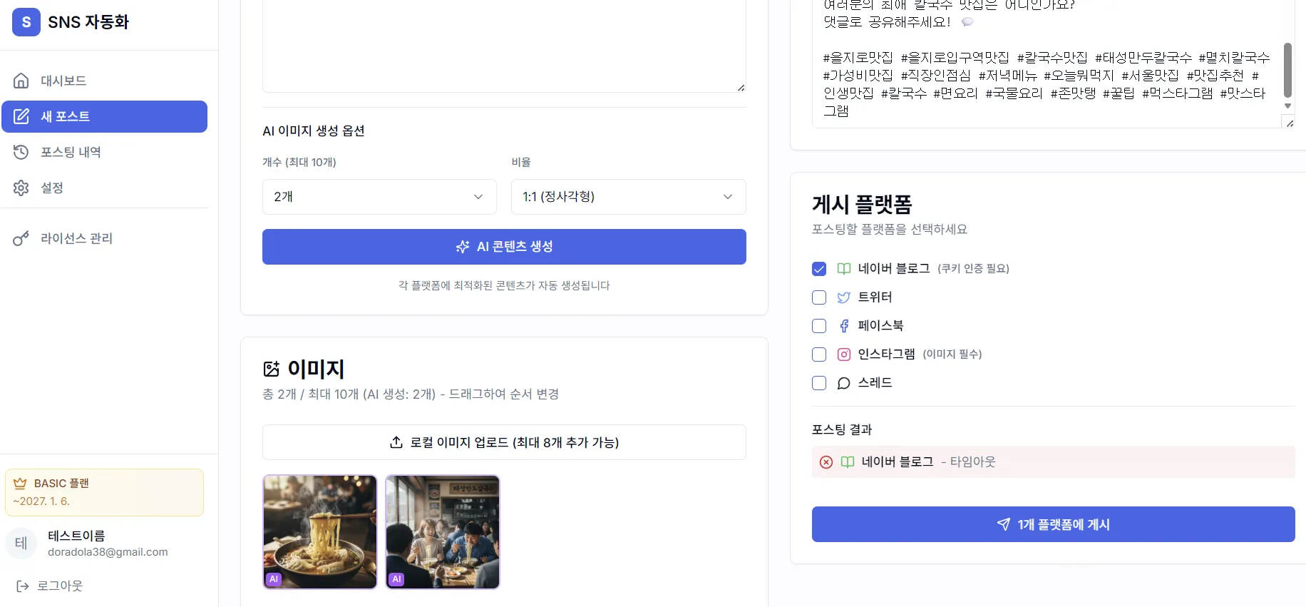 SNS (네이버 블로그, 인스타그램, 페이스북, 트위터, 쓰레드) 각 플랫폼에 맞게 SEO최적화된 포스팅 글을 AI통해 생성하고 포스팅 및 태그까지 원클릭으로 작성해주는 웹서비스입니다. 상담 -> 결제 -> 웹사이트 제공 -> 회원가입 -> 라이센스키 제공 -> 포스팅까지 1시간 내에 하실 수 있도록 지원해드립니다. 네이버블로그계정인스타그램계정(프로페셔널 only)페이스북계정(페이지 only)쓰레드계정트위터계정