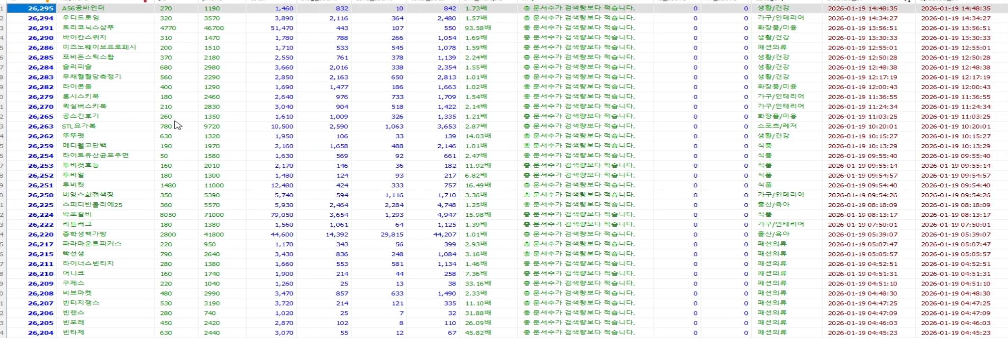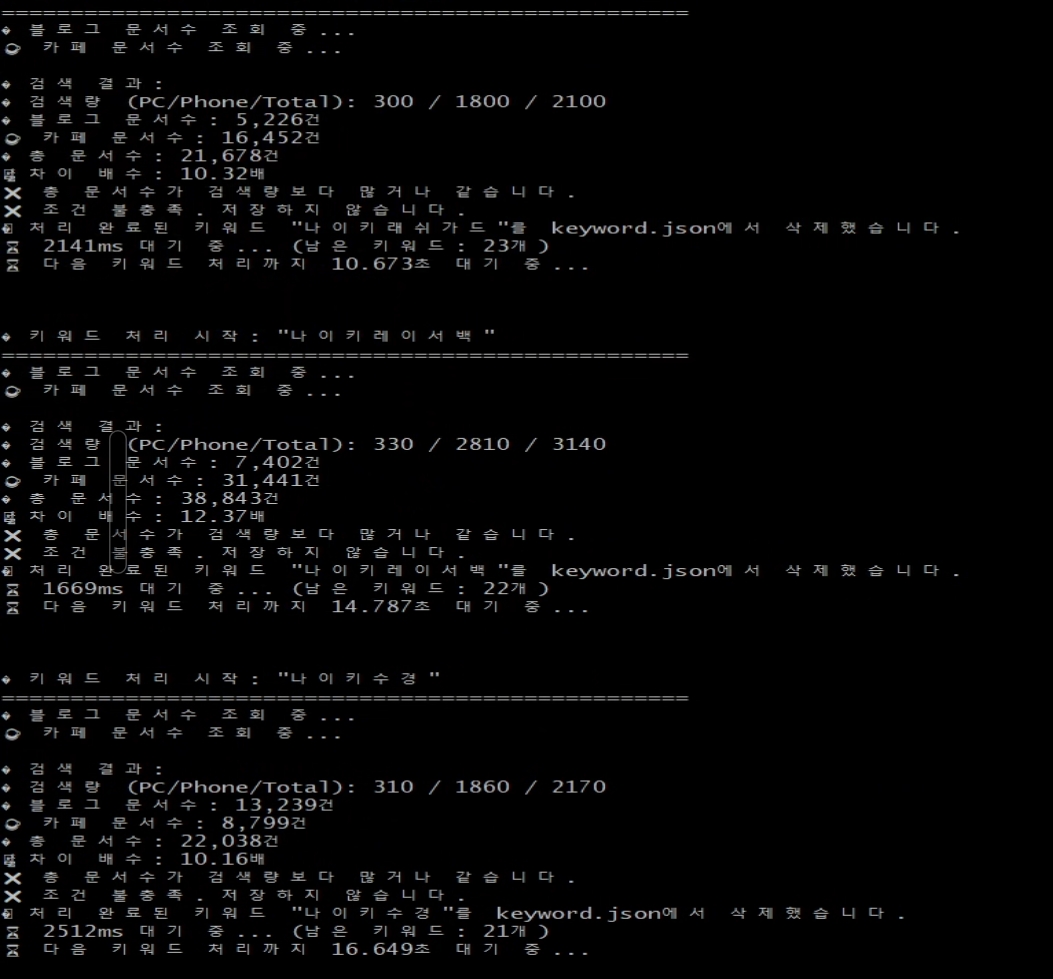이런 분들께 추천드립니다- 블로그 및 스토어 운영을 위해 키워드 데이터를 체계적으로 관리하고 싶으신 분- 스마트스토어 상품명, 콘텐츠 기획에 활용할 객관적인 키워드 지표가 필요하신 분- 키워드 리서치에 소요되는 반복 작업을 자동화하고 싶으신 분- 수작업 대신 데이터 기반으로 콘텐츠 주제를 선정하고 싶으신 분- 여러 키워드 도구 구독 없이 하나의 자동화 시스템으로 관리하고 싶으신 분히든 키워드란?본 서비스에서 정의하는 히든 키워드는검색량 대비 관련 콘텐츠 수가 상대적으로 적은 키워드를 의미합니다.예시:- 월 검색량은 충분하나, 블로그·카페 내 관련 문서 수가 과도하지 않은 키워드- 데이터 지표를 기준으로 콘텐츠 활용 가능성이 있는 키워드※ 본 서비스는 특정 결과(노출, 순위)를 보장하지 않으며, 콘텐츠 기획 및 운영에 참고할 수 있는 데이터 제공 목적의 기술 서비스입니다.수작업 리서치의 한계키워드를 수동으로 조사할 경우- 키워드 1개 분석에 수 분 이상 소요- 다수 키워드 분석 시 많은 시간과 반복 작업 발생본 서비스는 이러한 과정을 자동화 시스템으로 대체하여 운영 효율을 높이는 데 목적이 있습니다.시스템 기능 상세1. 키워드 자동 수집- 쇼핑 및 트렌드 기반 키워드 자동 수집- 카테고리별 분류 지원 (패션, 뷰티, 식품, 가전 등 대분류 기준)- 일간 / 주간 / 월간 기준 데이터 수집2. 검색량 자동 조회- PC / 모바일 기준 월간 검색량 조회- 설정 기준 이하 검색량 키워드 자동 제외 가능3. 문서 수 데이터 분석- 블로그 문서 수 조회- 카페 문서 수 조회- 검색량 대비 문서 수 비율 자동 계산4. 조건 기반 키워드 선별- 설정한 조건에 부합하는 키워드만 자동 저장- 조건 예시- 검색량 대비 문서 수가 특정 기준 이하인 경우- 검색량과 문서 수의 비율 조건 설정 사용 목적에 맞는 키워드 데이터 정리 및 관리 지원5. 무인 자동 운영 환경- 24시간 자동 실행- 오류 발생 시 자동 재시작- 서버 재부팅 시 자동 실행 설정 지원안내 사항- 본 서비스는 검색 시스템을 조작하거나 결과를 보장하는 서비스가 아닙니다.- 키워드 데이터 수집, 분석, 자동화 환경 구축을 제공하는 기술 기반 서비스입니다.- 콘텐츠 활용 및 운영 방식에 따라 결과는 달라질 수 있습니다. 상담 - 크몽 메시지로 요구사항 파악 (추가 옵션 필요 여부 확인) | 당일 |견적 확정 - 옵션 선택에 따른 최종 견적 안내 및 결제 | 당일 |세팅 - 프로그램 세팅 및 옵션 적용 | 3~5일 |원격 설치 - 의뢰인 서버에 원격 접속하여 설치 및 초기 세팅 | 3~5시간 |테스트 실행 - 실제 키워드 수집 테스트 및 정상 작동 확인 | 1시간 |인수 완료 - 사용 매뉴얼 전달 및 최종 확인 | 당일 |A/S 기간 - 설치 후 2주 무료 지원 서버 - Linux 또는 Windows 서버 (클라우드 권장) | AWS |서버 사양 - 최소 1GB RAM, 1 Core 이상 | 월 1~2만원 수준 |원격 접속 정보 - SSH 또는 원격 데스크톱 접속 정보 | 설치 시 필요 |서버가 없으신 경우: 서버 세팅 대행 옵션(+₩50,000) 을 추가해주세요.추가 필요한 내용은 상담 시 상세한 설명 드립니다.