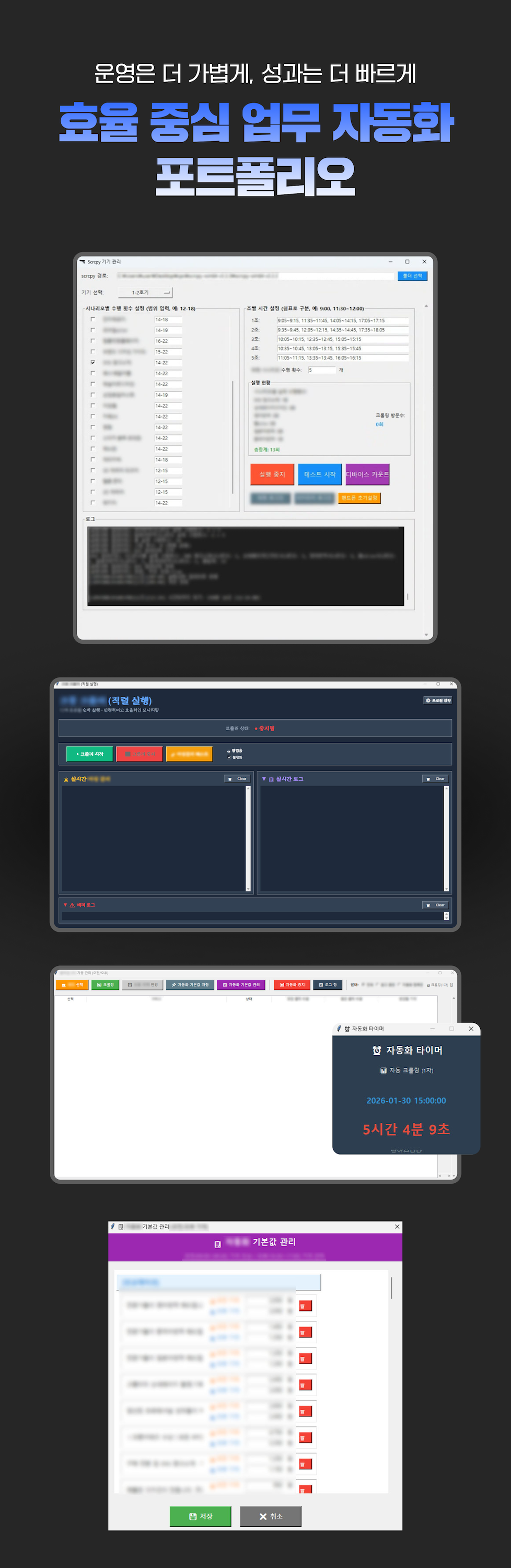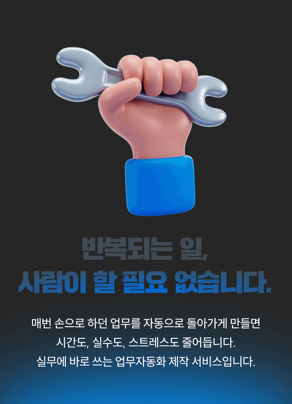 매일 반복되는 작업이 많아질수록 인건비와 실수도 함께 늘어납니다.업무 자동화는 일을 빠르게 하는 것이 아니라 구조를 바꾸는 선택입니다.사람이 하던 일을 시스템이 대신하도록 설계해드립니다.반복 업무를 정확히 짚어 자동화 막연한 자동화가 아니라 지금 가장 비효율적인 업무부터 정리합니다. 실무 환경 맞춤 설계현장에서 실제로 쓰는 방식 그대로 자동화 구조를 만듭니다.인적 오류 최소화복사·붙여넣기, 수기 입력, 누락 같은 사람 실수를 구조적으로 차단합니다.장기적인 비용 절감한 번 만들면 계속 인건비와 운영 시간을 아껴줍니다.엑셀 / 구글시트 자동화데이터 정리·분류·가공 자동화반복 입력 업무 자동화메일 발송·알림 자동화파일 생성·정리 자동화문서 자동 생성 시스템간단한 내부 관리 프로그램 제작자동화 구조 설명 및 사용 가이드[작업 프로세스] 업무 구조 및 반복 작업 분석지금 어떤 일이 가장 많이 반복되고 있는지 정리합니다. 자동화 범위 및 우선순위 정의 자동화가 가장 효과적인 영역부터 선정합니다. 구조 설계 및 로직 구성업무 흐름을 코드 구조로 정리합니다. 프로그램 제작 및 테스트실제 환경에서 안정적으로 작동하도록 구현합니다. 최종 정리 및 전달사용법과 관리 방법을 함께 정리해 전달합니다.[수정 / 추가 옵션 / 유의사항]-업무 방식 변경 시 자동화 구조 수정이 필요할 수 있습니다.-외부 서비스 연동은 별도 협의가 필요합니다.-보안·개인정보가 포함된 작업은 사전 협의 필수입니다.-상업적 사용 100% 가능합니다.[취소 / 환불 규정]작업 시작 전: 100% 환불작업 착수 후: 진행 범위만큼 공제 후 환불최종 디자인 전달 후: 환불 불가업무 자동화는 일을 편하게 만드는 게 아니라, 일하는 방식을 바꾸는 선택입니다.지금 반복하고 있는 그 작업 하나만 자동화해도 효율은 바로 달라집니다. 상담-결제-1차 작업 착수-중간 결과물 전달-수정 작업-최종본 전달-구매확정 순으로 진행됩니다 만드시고 싶은 자동화 작업에 대한 상세한 설명이 필요하오니, 꼭 첨부하여 전달 부탁드립니다