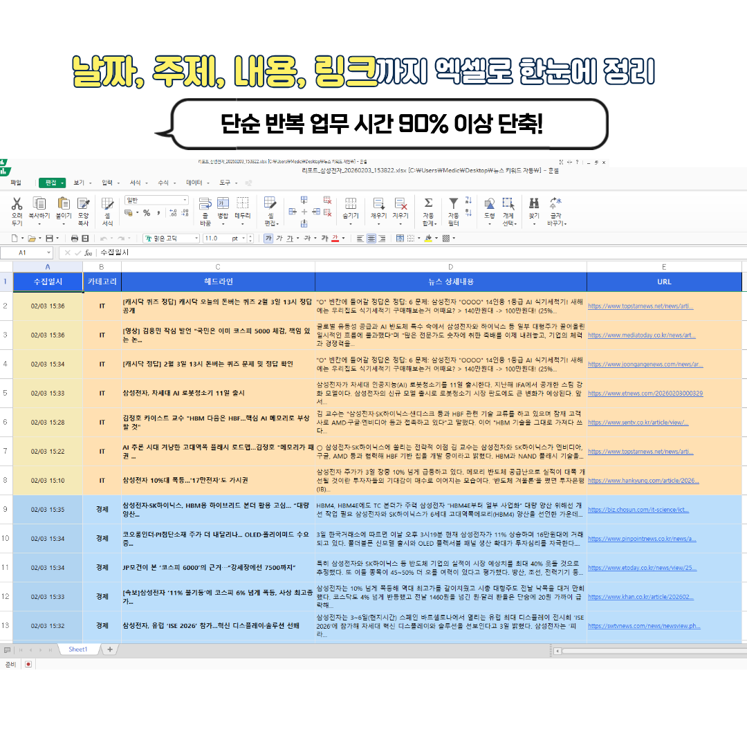 [초기 사용자 특별 혜택] 안내안녕하세요. 많은 분들이 부담 없이 프로그램을 사용해 보시고, 솔직한 피드백을 주셨으면 하는 마음에 초기 사용자 특별 혜택가로 제공합니다.현재 19,000원은 런칭 초기 한정 가격이며, 추후 서비스 안정화 및 목표 리뷰 달성 시 정상 가격으로 전환될 예정입니다.추가 유지비 없는 뉴스 자동화 솔루션을 소장하실 기회, 놓치지 마세요!매일 반복되는 뉴스 검색과 정리가 지겨워서, 제가 직접 쓰려고 만든 뉴스 자동화 프로그램 '뉴스헌터'를 공유합니다."매일 아침 특정 키워드 뉴스 검색""제목과 링크 복사해서 엑셀에 붙여넣기""중복된 기사인지 일일이 확인하기"이 지루한 단순 반복 업무, 이제 프로그램에게 맡기고 커피 한 잔 더 하세요.[ 이런 분들에게 강력 추천합니다 ]경쟁사 동향 파악, 업계 이슈 모니터링이 필수인 마케터/기획자내 주식 종목, 부동산 키워드 뉴스를 가장 먼저 알고 싶은 투자자관련 기사를 긁어모아 매일 보고서를 작성해야 하는 직장인월 구독료 나가는 프로그램이 부담스러우셨던 분 (추가 비용 없음)[ 뉴스헌터 핵심 기능 ](1) 신속한 검색 & 데이터 수집키워드 입력 후 엔터 한 번이면 최신 뉴스 100개가 순식간에 표시됩니다.국내 주요 포털 공식 데이터를 사용하여 정확도가 높습니다.(2) 엑셀 자동 리포트 생성버튼 클릭 한 번에 [제목 / 날짜 / 링크 / 요약 내용]이 정리된 엑셀 파일이 만들어집니다.보고서 양식으로 바로 사용할 수 있을 만큼 깔끔하게 정리됩니다.(3) 스마트한 저장 (중복 방지)같은 키워드로 여러 번 저장해도, 파일이 덮어씌워지지 않도록 자동으로 관리합니다.실수로 엑셀 파일을 켜둔 상태로 저장해도 프로그램이 꺼지지 않도록 안전장치를 적용했습니다.(4) 실시간 백그라운드 감시 (핵심 기능)프로그램을 켜두고 다른 업무를 보세요.새로운 뉴스가 등록되면 윈도우 우측 하단에 '알림 메시지'를 띄워줍니다.남들보다 빠르게 정보를 선점할 수 있습니다.(5) 추가 비용 없는 사용포털 개발자 센터의 무료 API를 활용합니다.프로그램 구매 비용 외에 추가로 들어가는 비용이 없습니다.[ 제공 내용 ]■ 뉴스헌터 프로그램 패키지 (19,000원)•뉴스헌터 프로그램 설치 파일 (EXE)•사용 매뉴얼 (PDF)•포털 API 발급 가이드북 (PDF)•추가 유지비 없는 영구 라이선스혼자서도 설치하고 사용하는 데 전혀 문제없도록 상세한 가이드를 제공합니다.[ 자주 묻는 질문 Q&A ]Q. 포털 계정이 필요한가요?A. 네, 포털의 뉴스 데이터를 가져오기 위해 계정이 필요합니다. (개인 정보가 유출되는 것이 아니라, 포털 개발자 센터의 '검색 API'를 활용하는 방식입니다.)Q. 컴퓨터를 잘 못하는데 API 발급이 어렵지 않나요?A. 전혀 어렵지 않습니다. 초보자도 따라 할 수 있도록 그림으로 된 설명서를 제공합니다. (약 3분 소요)Q. 사용 기간이 정해져 있나요?A. 아닙니다. 한 번 구매하시면 추가 비용 없이 계속 사용 가능합니다.Q. 윈도우 전용인가요?A. 네, Windows 10, 11 환경에서 정상 작동합니다. (맥북/애플은 지원하지 않습니다.)[ 구매 전 필수 확인 사항 ]본 프로그램은 PC 설치형(EXE) 파일로 제공됩니다.불법적인 용도(매크로 댓글, 여론 조작 등)로는 사용할 수 없습니다. 1단계 : 결제 및 자동 발송결제를 완료하시면 크몽 메시지를 통해 [프로그램 설치 파일 + 사용 매뉴얼]이 자동으로 발송됩니다.(※ 중요: 파일이 발송된 시점부터는 디지털 콘텐츠 특성상 환불이 제한됩니다.)2단계 : 설치 및 API 연동동봉된 '그림 가이드'를 보고 약 3분 만에 API 키를 발급받아 입력합니다.3단계 : 사용 및 구매 확정프로그램이 정상 작동하는지 확인합니다.문제가 없다면 [구매 확정]을 눌러 거래를 종료합니다.(사용 중 궁금한 점은 언제든 메시지 주시면 답변드립니다.) 원활한 프로그램 구동을 위해 Windows 10 또는 11 운영체제가 설치된 PC가 필요합니다. (맥북 및 모바일 환경은 지원하지 않습니다.)또한 포털 뉴스 데이터를 수집하기 위해 '포털 계정'이 필요합니다.(API 키 발급 과정은 구매 시 함께 보내드리는 [그림 설명서]를 보시면 누구나 3분 안에 완료하실 수 있습니다.)