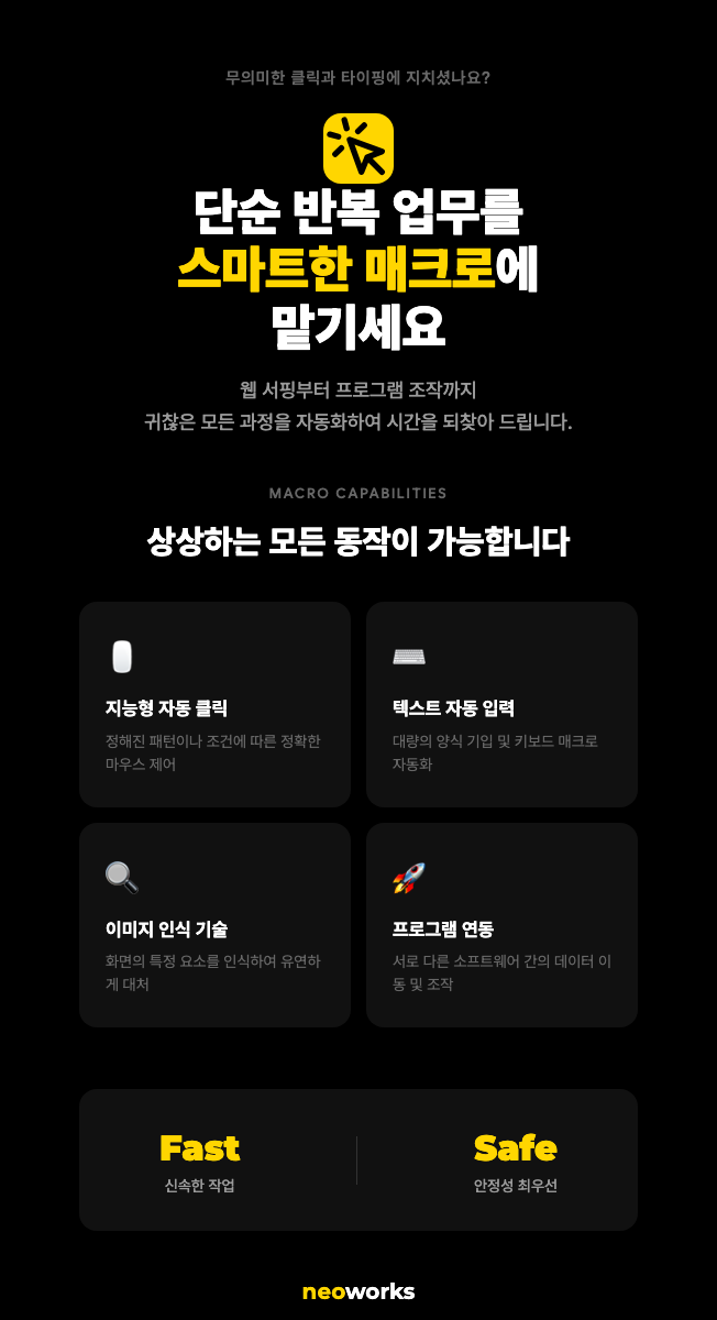 웹사이트 반복 작업, 이제 자동으로 해결하세요.매일 같은 사이트에 로그인하고, 양식 채우고, 데이터 복사하느라 시간을 낭비하고 계신가요? 웹 전문 매크로로 클릭 한 번에 모든 작업을 끝낼 수 있습니다.이런 업무를 자동화합니다• 쇼핑몰 주문 조회 및 데이터 수집• 여러 사이트 자동 로그인 및 정보 조회• 웹 양식 자동 입력 및 제출• 웹페이지 데이터를 엑셀로 자동 저장• 정기적인 웹사이트 체크 및 알림웹 매크로 전문 서비스의 장점입니다• 무제한 PC 사용 (추가 라이선스 비용 없음)• 크롬, 엣지, 파이어폭스 등 주요 브라우저 지원• 이미지 인식으로 화면 변화에도 안정적 작동• 오류 발생 시 자동 재시도 기능• 실행 스케줄 설정 가능단순 녹화 방식이 아닌 코딩 기반 안정적인 매크로로 예외 상황에도 끊김 없이 작동합니다. 간단하고 빠른 3단계 프로세스입니다.[1단계: 작업 파악]자동화하려는 웹사이트와 작업 순서를 알려주시면 됩니다. 작업 과정을 녹화한 영상을 보내주시면 더욱 정확합니다.[2단계: 매크로 제작]웹 전문 도구(Selenium, Playwright)로 안정적인 매크로를 개발하고 테스트합니다. 필요시 원격으로 환경을 점검합니다.[3단계: 납품 및 설명]완성된 매크로와 간단한 사용 매뉴얼을 전달합니다. 실행 방법과 주의사항을 안내해 드립니다. 이것만 준비해 주세요.✓ 매크로가 동작할 웹사이트 URL✓ 작업 순서 설명 (또는 녹화 영상)✓ 테스트용 계정 정보 (있는 경우)