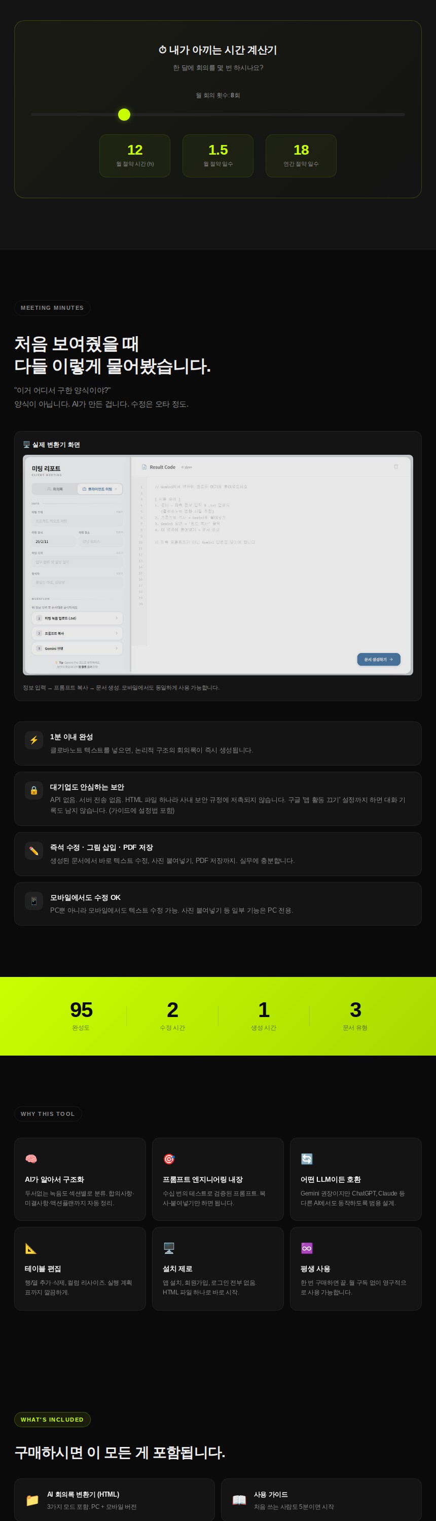 이런 분께 추천합니다• 회의 끝나고 회의록 정리에 1~2시간 쓰시는 분• 출장 다녀와서 보고서 쓰기 귀찮으신 분• 클라이언트 미팅 내용을 깔끔하게 정리하고 싶은 분■ 서비스 소개녹음 파일 하나면 회의록·출장보고서·클라이언트 미팅노트가 자동으로 완성되는 AI 변환기입니다.클로바노트(무료)로 녹음 → 텍스트 추출 → 변환기에 붙여넣기 → 완성된 문서를 바로 수정·저장할 수 있습니다.■ 3가지 문서 모드1. 회의록 모드: 안건별 논의 내용, 결정사항, 후속조치까지 자동 구조화2. 출장보고서 모드: 출장 목적·일정·핵심 내용·성과를 보고서 양식으로 정리3. 클라이언트 미팅노트 모드: 고객 요구사항·합의사항·후속 액션을 깔끔하게 정리■ 주요 특징• 서버 없음: 내 PC/모바일에서만 작동하므로 사내 보안 걱정 없음• 무료 AI 사용: Google Gemini 무료 계정으로 작동 (추가 비용 0원)• 문서 직접 수정: 생성된 문서를 클릭해서 바로 텍스트 수정 가능• 이미지/PDF 저장: 완성된 문서를 이미지 또는 PDF로 바로 저장• 섹션 추가/삭제: 필요에 따라 항목을 자유롭게 편집• 테이블 편집: 행/열 추가·삭제, 열 너비 조절 가능• 모바일 지원: 스마트폰에서도 사용 가능■ 납품 내용• AI 회의록 변환기 (링크 제공)• 상세 사용 가이드 PDF• 클로바노트 설치 및 사용법 안내 포함■ 작업 방식결제 후 바로 링크와 가이드를 보내드립니다.가이드를 따라 5분이면 첫 문서를 만들 수 있습니다.사용 중 궁금한 점은 메시지로 문의해 주세요.■ 유의사항• 녹음 품질이 좋을수록 변환 결과가 정확합니다.• 클로바노트 앱 설치가 권장됩니다(필수X)• Google Gemini 무료 계정이 필요합니다 (가이드에 안내 포함).문의사항은 여기로 주시면됩니다카카오톡: hjy8475 1. 결제 확인 후 변환기 링크 + 사용 가이드 PDF를 메시지로 전달드립니다.2. 가이드를 따라 클로바노트 설치 → Gemini 계정 준비를 진행합니다.3. 녹음 파일로 첫 문서를 생성해 보시고, 궁금한 점은 메시지로 문의해 주세요.4. 정상 작동 확인 후 구매 확정 부탁드립니다. 1. 스마트폰 (클로바노트 앱 설치(권장) — 무료 월 600분)2. Google 계정 (Gemini 무료 사용을 위해 필요)3. 회의 녹음 파일 또는 텍스트 (변환할 내용)※ 위 준비물은 모두 무료이며, 가이드 PDF에 설치 방법이 상세히 안내되어 있습니다.